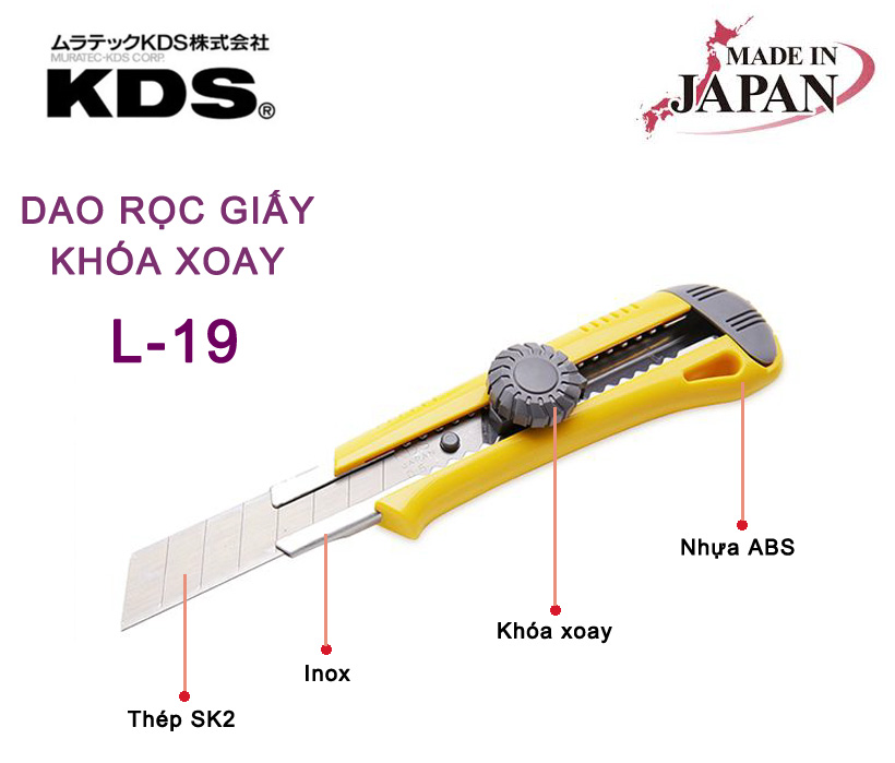 DAO RỌC GIẤY KHÓA XOAY KDS L-19 THÔNG SỐ KỸ THUẬT DAO RỌC GIẤY KDS L-19 : - Chất liệu: Inox, nhựa ABS - Kích thước: 16cm x 4cm x 2.5cm - Kích thước