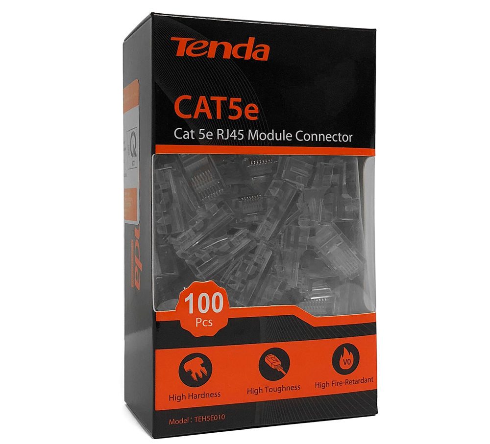 Đầu RJ45 CAT5e Tenda TEH5E010 tương thích với loại dây cáp CAT5e là sản phẩm nâng cấp dựa trên cáp mạng tiêu chuẩn CAT5 ( loại cáp mạng cơ bản nhất, gồm hai loại là UTP không có lớp lá kim loại giảm nhiễu và FTP có lớp lá kim loại giảm nhiễu.) với các tiêu chuẩn tốt hơn về vật liệu, thiết kế và khả năng truyền tải.