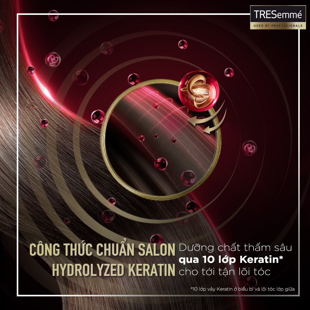 BAO BÌ THAY ĐỔI THEO TỪNG ĐỢT NHẬP HÀNG Trọn bộ bí quyết từ các nhà tạo mẫu tóc cho mái tóc suôn mượt chuẩn salon  Tóc bạn không còn suôn mượt vào nếp sau cả ngày dài hay dù có thử mọi cách nhưng cũng không thể đẹp như ở salon? Bạn có biết, để sở hữu một mái tóc vào nếp suôn mượt suốt cả ngày, tóc mình phải được nuôi dưỡng mềm mượt ngay từ sâu bên trong? Và một trong những liệu pháp hiệu quả nhất chính là bổ sung protein Keratin & tinh dầu dưỡng tóc giúp thấm sâu & nuôi dưỡng từng sợi tóc. Thay vì phải ra salon thường xuyên mất nhiều thời gian và chi phí, TRESemmé đem lại cho bạn bí quyết dưỡng tóc từ các chuyên gia tạo mẫu tóc trên thế giới, cho mái tóc của bạn đẹp chuẩn salon ngay tại nhà - với Dầu Gội TRESemmé Keratin Smooth! Ưu điểm nổi bật  Bộ dầu gội xả TRESemmé Keratin Smooth chứa công thức ưu việt CHUẨN SALON được đặc chế với dưỡng chất Keratin Thủy Phân (Hydrolyzed Keratin) và các Hạt Dưỡng Chất Mềm Mượt Siêu Nhỏ giúp nuôi dưỡng và thấm sâu tới 10 lớp Keratin cho tới tận lõi tóc*, phục hồi hư tổn chuyên sâu cho mái tóc của bạn. Hydrolyzed Keratin (Keratin Thủy Phân) vốn là những hạt dưỡng chất Keratin có kích thước và khối lượng nhỏ cùng với tính ưa nước nên dễ dàng thẩm thấu vào bề mặt tóc hư tổn vốn rất khô xơ do mất ẩm, thay thế lượng protein đã mất, từ đó trả lại cho nàng mái tóc sự mềm mại, bóng mượt như vừa bước ra khỏi salon! Hiệu quả sử dụng