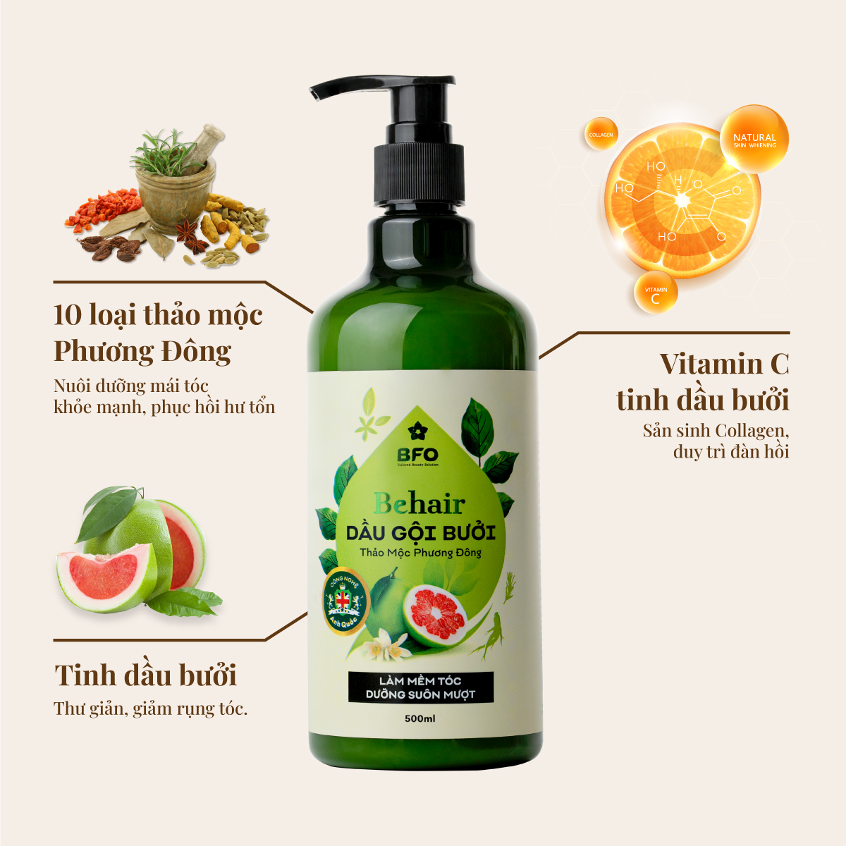 - Tinh dầu Bưởi kết hợp cùng 10 loại thảo mộc Phương Đông giúp làm sạch, cung cấp dưỡng chất phục hồi tóc hư tổn, dưỡng tóc suôn mượt.