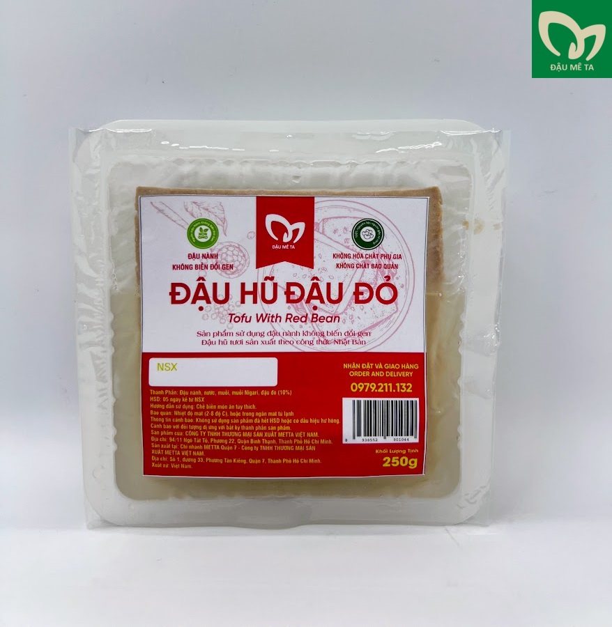 Với sản phẩm tươi sống, trọng lượng thực tế có thể chênh lệch khoảng 10%. ĐẬU HŨ TƯƠI ĐẬU ĐỎ 250G Thành Phần: Đậu nành (đỗ tương), Nước, Muối biển Nigari, Đậu đỏ(10%) HSD: 5 ngày kể từ ngày sản xuất Bảo quản: Nhiệt độ mát (2-8 độ C), hoặc trong ngăn mát tủ lạnh Thông tin cảnh bảo: Không sử dụng sản phẩm đã hết HSD hoặc có dấu hiệu hư hỏng. Cảnh báo dị ứng với bất kỳ thành phần nào của sản phẩm. CÔNG TY TNHH THƯƠNG MẠI SẢN XUẤT METTA VIỆT NAM Chuyên sản xuất cung cấp ĐẬU HŨ TƯƠI NGUYÊN CHẤT Nguồn đậu nành KHÔNG biến đổi genNguồn gốc xuất xứ nguyên liệu rõ ràng, đảm bảo theo tiêu chuẩn quy địnhĐậu Hũ được làm từ muối Nigari Nhật BảnChuyên cung cấp cho Nhà Hàng, Quán Ăn, CafeNhà xưởng máy móc hiện đại, đáp ứng chuẩn tiêu chuẩn phân khúc nhà hàng, quán ăn