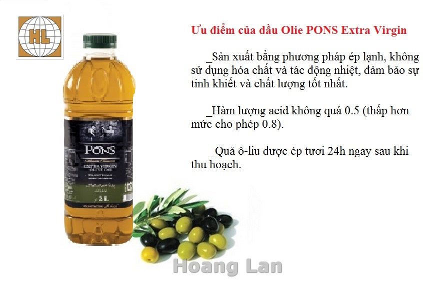 - Dầu Olive Extra Virgin PONS 1 lít - Tây Ban Nha (Chai nhựa) - _Thời hạn sử dụng: 30 tháng kể từ ngày sản xuất - _NSX, HSD: Xem trên bao bì. - _Thể tích thực: 1L ( Chai nhựa ) - _Xuất xứ: Euroaliment P.A.C., S.L.U (Tây Ban Nha) - - Đây là một loại chất béo được chiết xuất từ loại quả của cây Olive hay có tên quốc tế là Olea Europaea. Loại cây này là đặc sản mang tên tuổi của vùng đất Địa Trung Hải. Dầu Olive được sử dụng rộng rãi trong cuộc sống. Tuy nhiên được ưu tiên và chú trọng trong lĩnh vực mỹ phẩm, nấu ăn và dược liệu. - - _ Dầu Olive Extra Virgin PONS 250ml - Tây Ban Nha được sản xuất theo phương pháp ép lạnh, không đòi hỏi sử dụng hóa chất hay tác động nhiệt vào quy trình, giúp dầu giữ lại được các chất dinh dưỡng và có độ tinh khiết cao nhất. Vì vậy mà dầu Olive ép lạnh được nghiên cứu là mang lại nhiều lợi ích về sức khỏe hơn dầu Olive thông thường. - - _ Phần lớn chất béo chứa trong dầu Olive Pons Extra Virgin đều là chất béo không bão hòa rất tốt cho sức khỏe. Tiêu thụ chất béo không bão hòa giúp giảm khả năng mắc các bệnh tiểu đường loại 2, tim, ung thư và bệnh mãn tính. Dầu Olive ép lạnh cũng chứa ít nhất 30 hợp chất thực vật có lợi, nhiều chất chống oxy hóa mạnh có tác dụng chống viêm, hạ huyết áp, ngăn chặn sự phát triển của một số loại ung thư. Dầu Olive hoàn toàn có thể thay thế dầu ăn thông thường và là thực phẩm bổ sung lành mạnh. - - _Dầu có hàm lượng acid không quá 0.5o - - _Hương vị thơm ngon đậm đà hơn nhờ quả ô-liu được ép tươi ngay sau khi thu hoạch - - _Thành phần: Dầu Olive nguyên chất 100% được sản xuất theo phương pháp ép lạnh quả tươi ngay sau khi thu hoạch. -