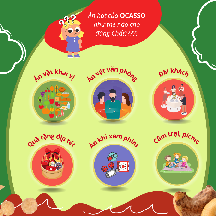 ĐẬU PHỘNG TỎI ỚT Đặc tính nổi bật sản phẩm: -Đậu Phộng OCASSO 100% hạt nguyên liệu được chọn lọc kỹ càng từ Việt Nam và nhập khẩu. Sản xuất ưu tiên giữ lại 100%