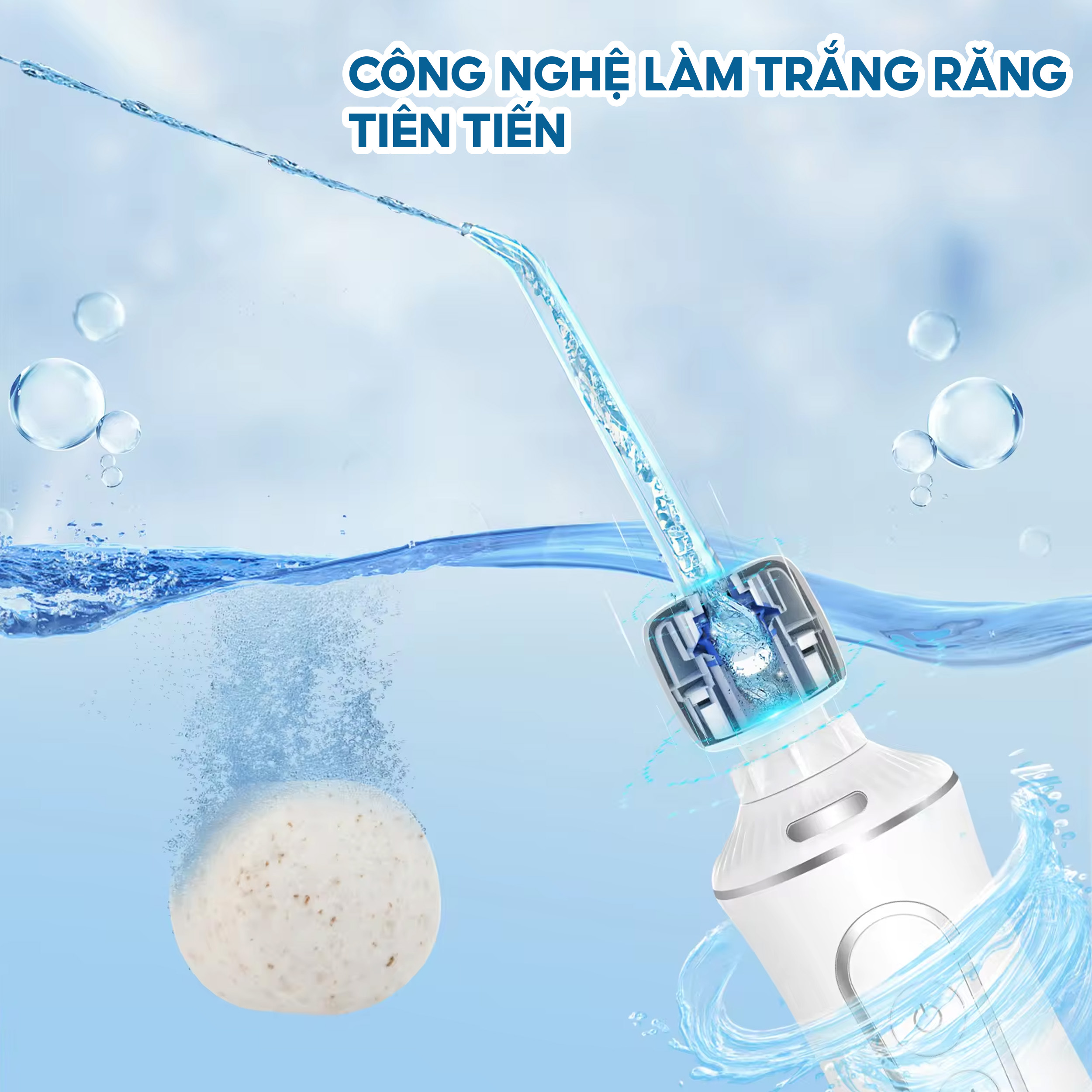 - Đầu tăm có chỗ đựng viên trắng răng , sử dụng tia nước đẩy các tinh chất trắng răng len lỏi bề mặt và kẽ răng, giúp tăng cường hiệu quả làm trắng răng. -Combo trắng răng với 30 viên dạng nén sử dụng liên tiếp trong 30 ngày cho khác biệt rõ rệt
