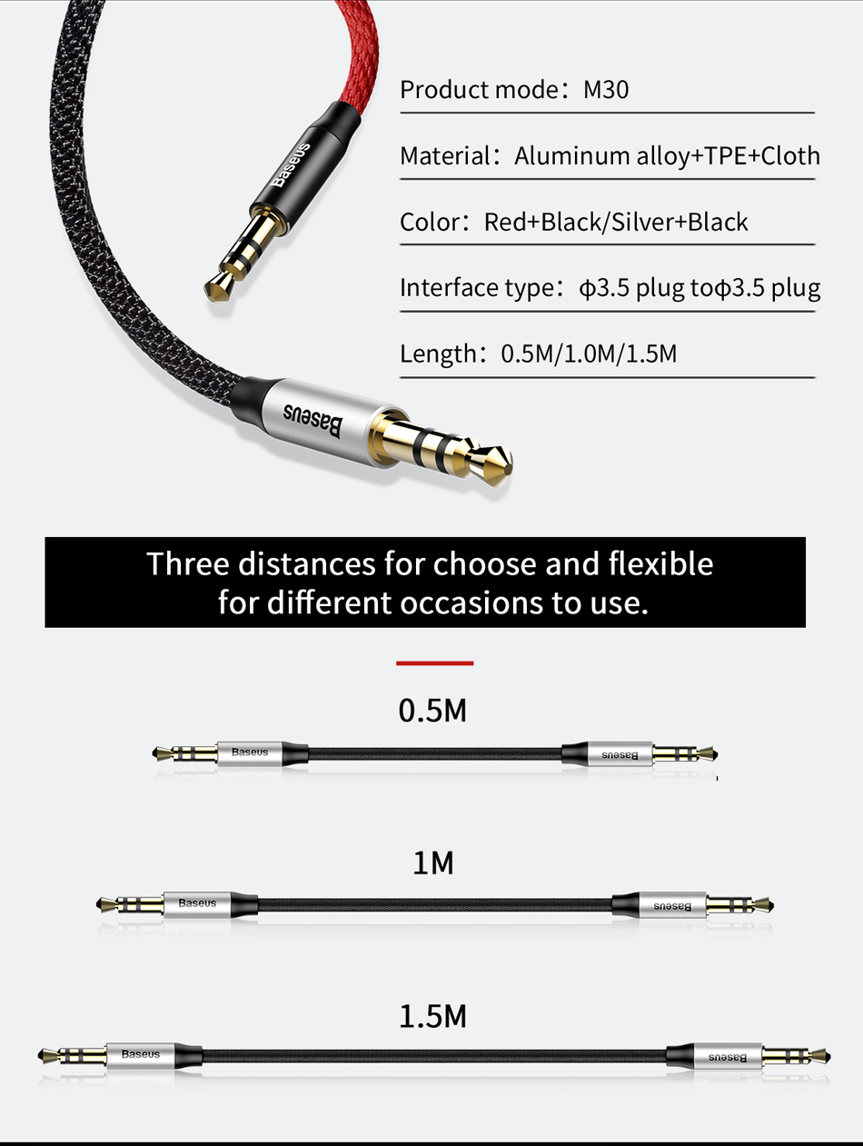 Giới thiệu sản phẩm Dây cáp âm thanh chất lượng cao AUX Audio 3.5 Baseus Yiven Audio Cable M30 (Aux Cable 3.5mm Jack Male to Male) Tính năng sản phẩm Dây cáp âm thanh chất lượng cao AUX Audio 3.5 Baseus Yiven Audio Cable M30 (Aux Cable 3.5mm Jack Male to Male)
