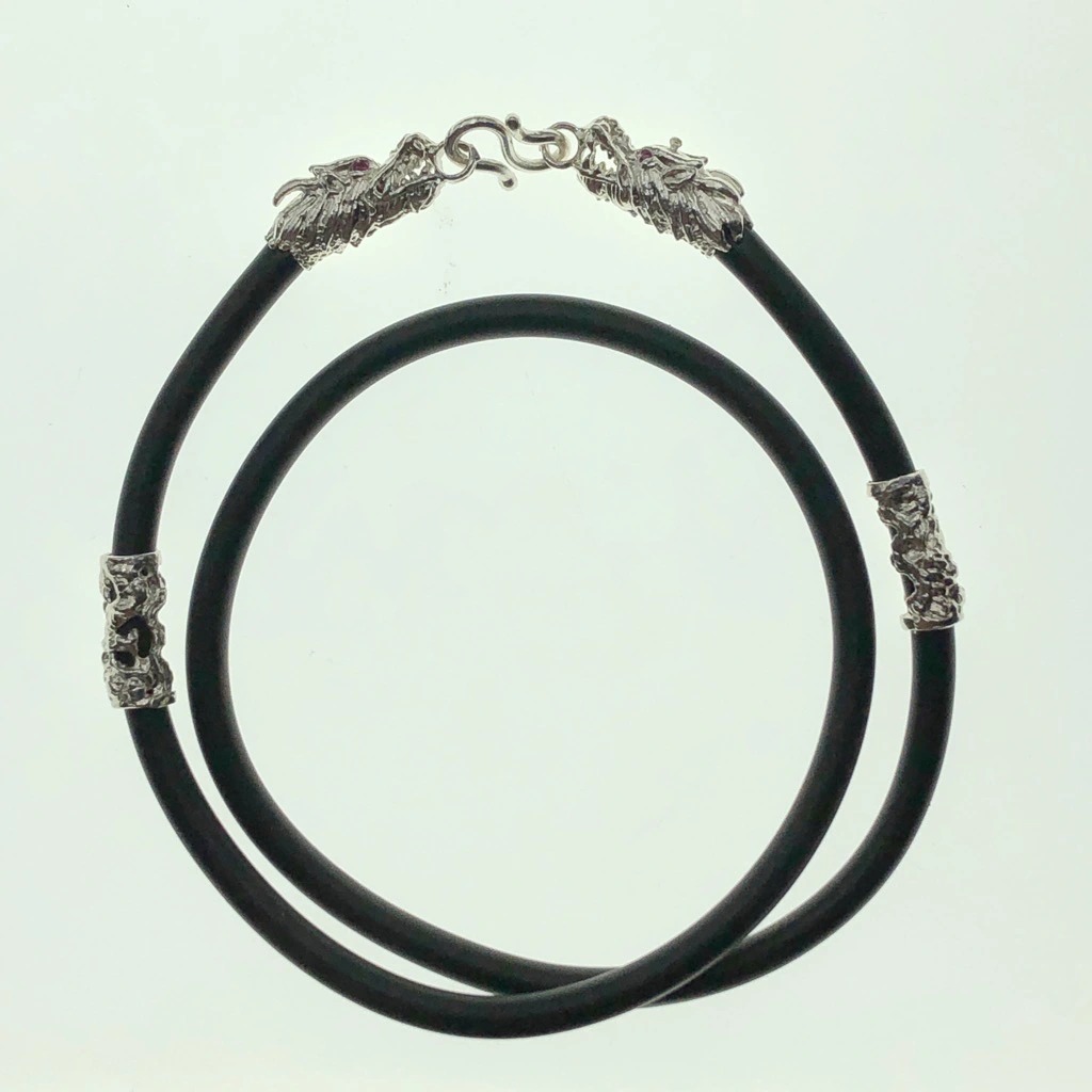 Dây chuyền vòng cổ Cao Su bọc bạc được làm từ Bạc kết hợp với cao su Việt Nam có ưu điểm bền đẹp, không bị hôi và không gây dị ứng. Dây chuyền vòng cổ Cao Su nam được bọc 2 đầu rồng chất liệu bạc ta 925 đây là loại bạc thật được đúc nguyên khối hình dáng chi tiết sắc nét.