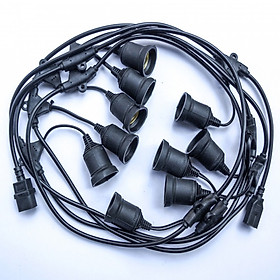 Dây đui E27 ngoài trời. Phong cách châu âu, tiêu chuẩn chống nước. Quy cách 1 bộ dài 5m 10 đui, 10m 20 đuôi đèn, đầu cuối có đầu chờ để cắm sang dây tiếp theo, rất tiện loại trang trí chiếu sáng ngoài trời. Dây 10m có 20 đuôi đèn nghĩa là khoảng cách 50cm 1 đuôi , Quý khách có thể dùng Bóng LED Edison vỏ thủy tinh trong suốt hoặc Bóng LED tròn vỏ nhựa kín đuôi.