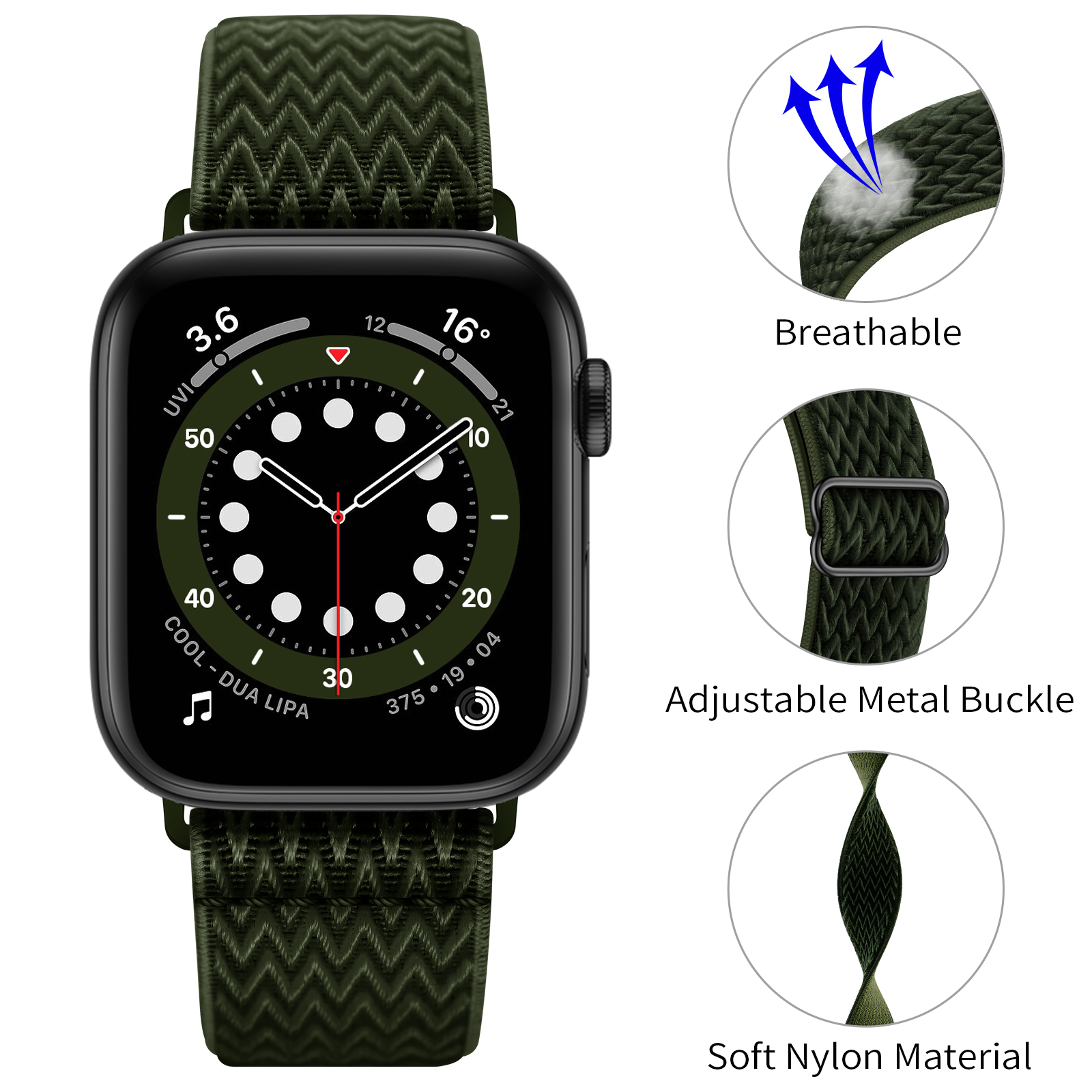 Dây đồng hồ được làm bằng vải dệt nylon có độ đàn hồi cao, không bị biến dạng sau khi giãn và có thể nhanh chóng trở lại hình dạng ban đầu, do vải được