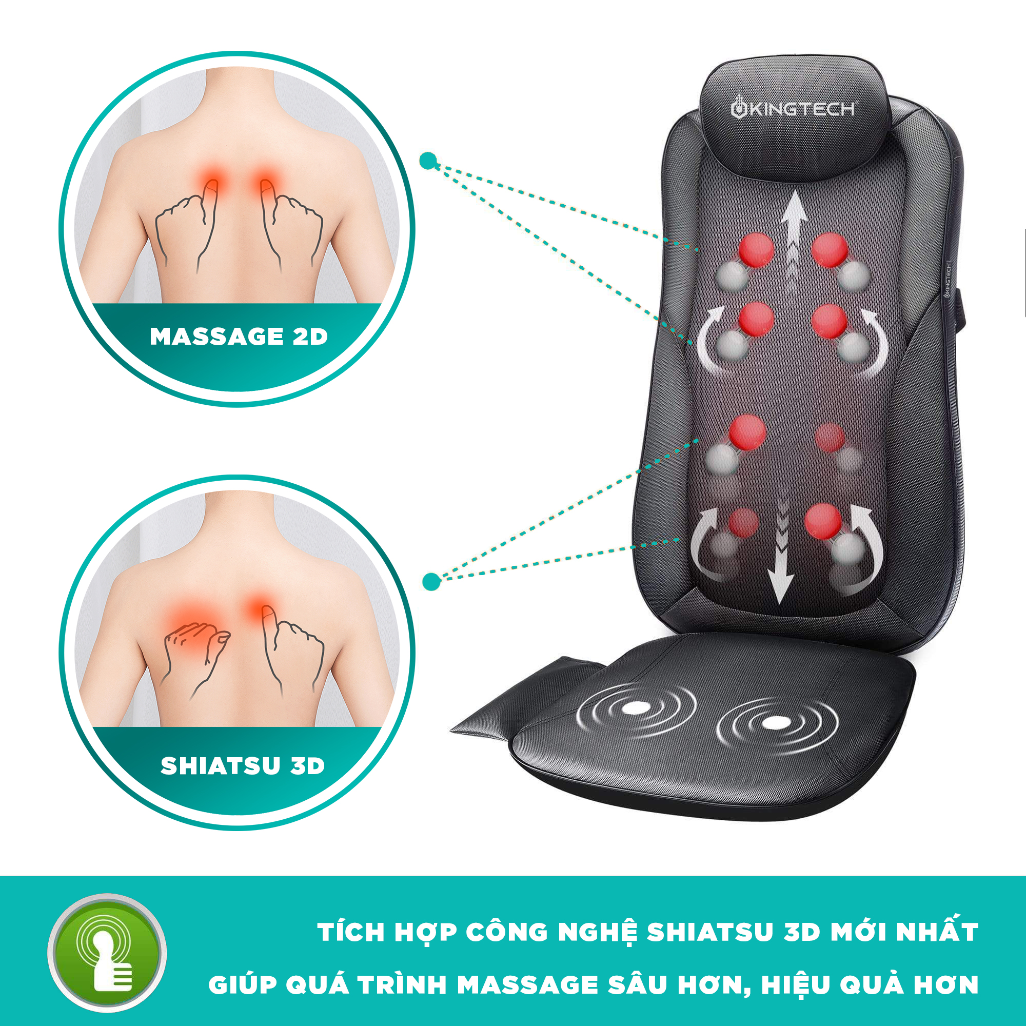 - Lựa Chọn Tuyệt Vời Để Làm Quà Tặng: KINGTECH nổi tiếng với các sản phẩm Massage chất lượng, dịch vụ khách hàng tốt. Mỗi máy xa mát của KINGTECH đều sử dụng một hộp và hướng dẫn tiếng Việt riêng, có độ hoàn thiện rất cao. Máy Massage KINGTECH KC-500S sẽ là món quà lý tưởng cho bố mẹ ,vợ , chồng và bạn bè của bạn. Mua hàng KHÔNG rủi ro, Hãy "THÊM VÀO GIỎ HÀNG" ngay hôm nay! THÔNG TIN CHI TIẾT: Da Pu chất lựơng cao & Vải Mesh thoáng khí: Bề mặt KC-500S làm bằng bằng da PU chất lượng cao chống mài mòn, kết hợp với vải lưới mềm mại thoáng khí mang lại cảm giác thoải mái khi tiếp xúc. Chức năng nhiệt hồng ngoại: Đầu các massage của thiết bị tích hợp đèn hồng ngoại. Chức năng nhiệt tùy chọn, bổ sung độ ấm nhẹ nhàng tăng cải thiện massage giúp thư giãn cơ bắp, xoa dịu mệt mỏi. Có thể sử dụng: Tại nhà, trên ô tô, nơi làm việc: >>>> TẠI SAO NÊN CHỌN KINGTECH <<<<
