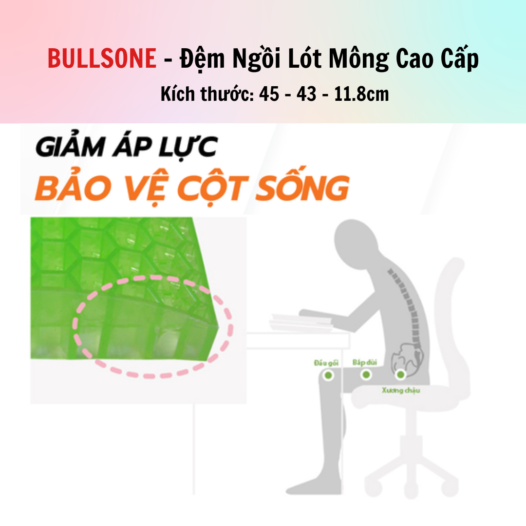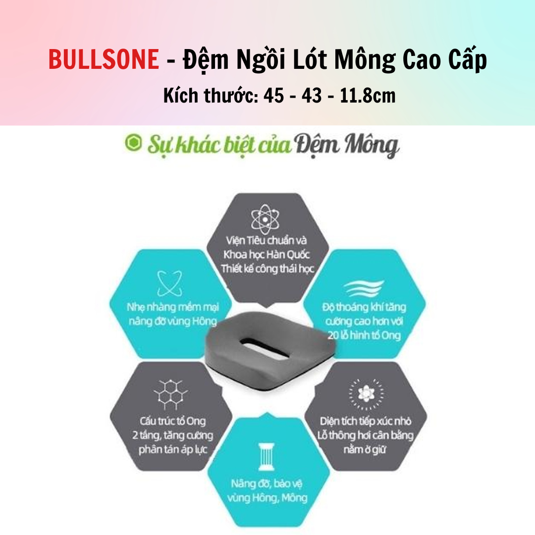 MÔ TẢ SẢN PHẨM   Bullsone là sản phẩm có xuất xứ từ Hàn Quốc và đạt chứng nhận về tiêu chuẩn quốc tế. Bên cạnh đó, sản phẩm này đăng ký FDA của Mỹ và đoạt giải thiết kế Reddot năm 2016. Ngoài đệm ngồi, thương hiệu Bullsone còn được rất nhiều khách hàng biết đến với các sản phẩm phụ kiện chăm sóc xe ô tô tại Việt Nam và Hàn Quốc. Tất cả các sản phẩm của hãng đã được chứng nhận có độ bền cao, thân thiện với môi trường, an toàn cho sức khỏe của khách hàng và được nhiều người lựa chọn làm phụ kiện không thể thiếu cho chiếc ô tô của mình.     Được thiết kế theo hình dáng cơ thể con người giúp duy trì tư thế ngồi thằng lưng, thiết kế dành riêng cho người đau vùng thắt lưng, cột sống, xương chậu, vùng đùi và người bị bệnh trĩ.   Cấu trúc tổ ong hai lớp hình lục giác độc lập, công dụng chống rung chuyển,chống va đập.   Giúp phân tán đều áp lực cơ thể   Khả năng tự làm mát và tái tạo nguồn không khí mới, ngồi lâu không sợ bị nóng hoặc đổ mồ hôi.   Thiết kế đẹp, thời trang, với vỏ bọc mềm mại.   Chống trượt tối ưu, giữ dáng ngồi không bị nghiêng lệch.   Diện tích của tấm đệm rộng tiếp xúc với toàn bộ cơ thể của bạn khi ngồi và phù hợp cho mọi loại ghế hay trên sàn nhà ; trên ô tô hay tại nơi làm việc ; trong nhà hay ngoài trời.   Có thể giặt rửa vệ sinh và giữ gìn lâu dài.   Chịu được nhiệt độ cao đến 70 độ C.   Sản phẩm còn đạt chứng nhận CE dành cho thiết bị y tế, đoạt giải thiết kế  năm 2016 và nhiều công bố y học trên truyền thông quốc tế.   Đệm mông chỉnh hình đáng tin cậy này thực sự giúp giảm đau từ nhẹ đến nặng ở phần lưng, đau mông và đau thắt lưng, đau thần kinh tọa hoặc đau đùi; SP cũng dùng như một chiếc đệm trĩ, giúp khắc phục đau nhức ở phần xương cụt và các khu vực xung quanh.   Hoan nghênh liên hệ để được trải nghiệm và dùng thử sản phẩm.