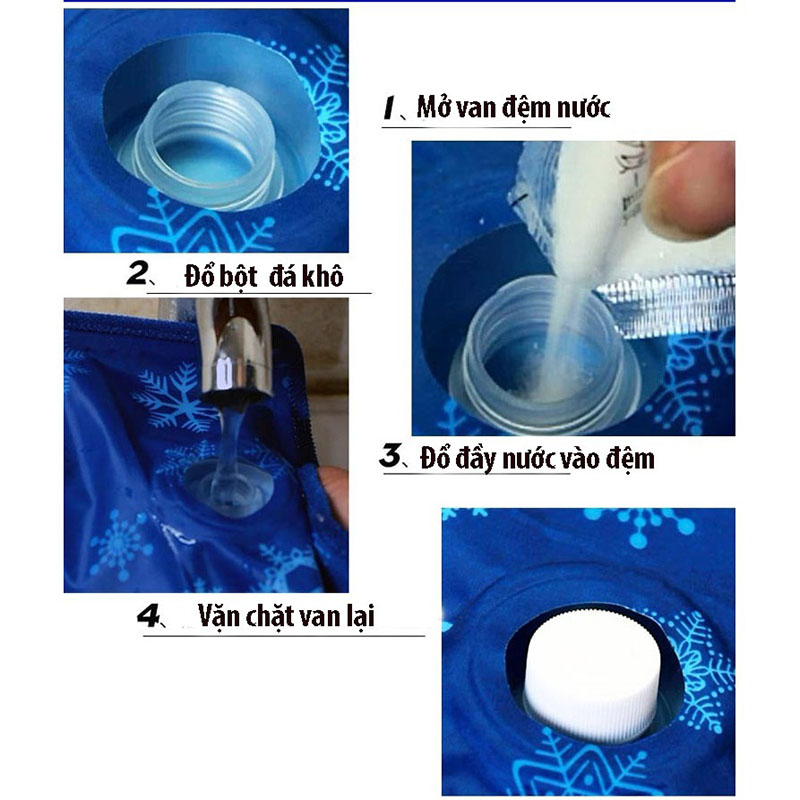 Kích cỡ : 45*45cm ( Dài x rộng ) Tải trọng : 150kg Màu sắc : Xanh biển đậm ( Hình bông tuyết ) Sản phẩm bao gồm : 1 đệm nước ( Chưa cho