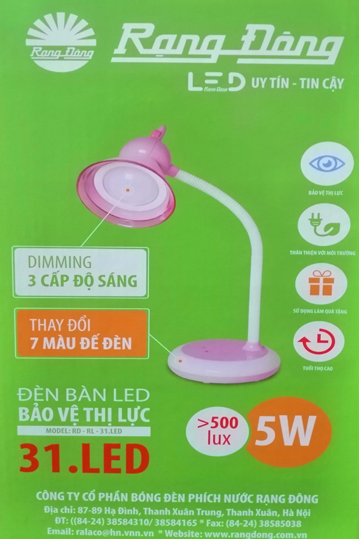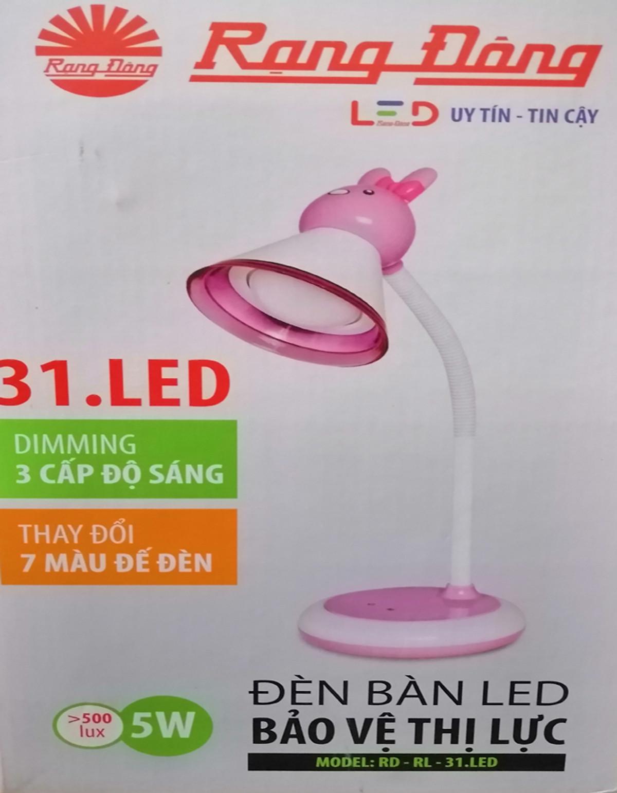 1. Đặc tính của đèn: · Model : RD-RL-31.LED · Nguồn điện danh định: 220V/50Hz. · Công suất: 5W · Đèn bàn LED Rạng Đông bảo vệ thị lực · Thiết kế sang trọng, màu sắc trang nhã, lịch sự · Tích hợp cảm ứng điều chỉnh ánh sáng 3 mức độ và thay đổi 7 màu sắc đế đèn Độ rọi trung bình trên mặt bàn: > 500 lux