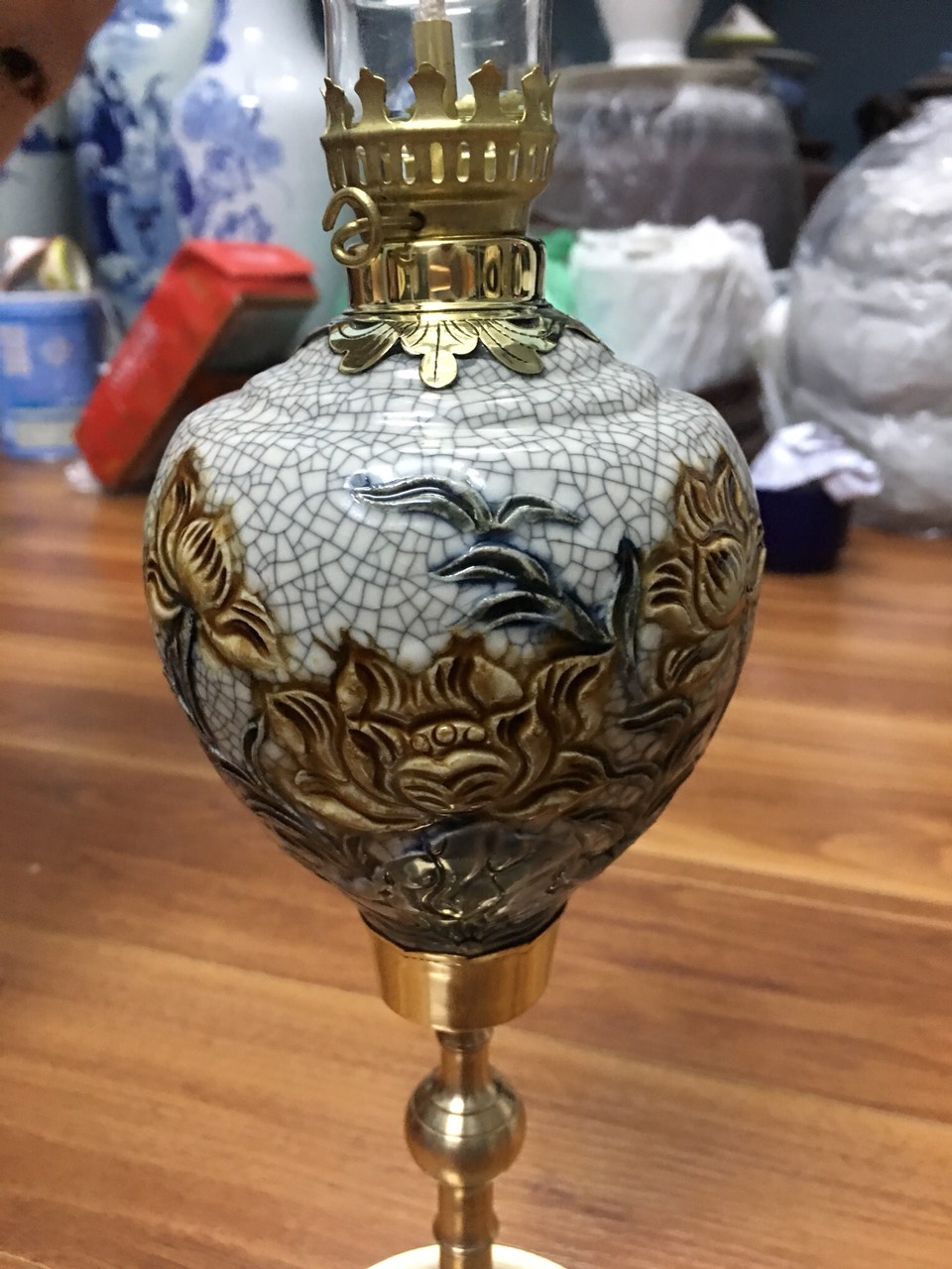 Đèn dầu gốm sứ men rạn Bát Tràng chân đồng đắp nổi hoa sen Từ lâu đèn dầu đã đóng vai trò quan trọng trong văn hóa thờ cúng của người Việt Nam. Chiếc đèn