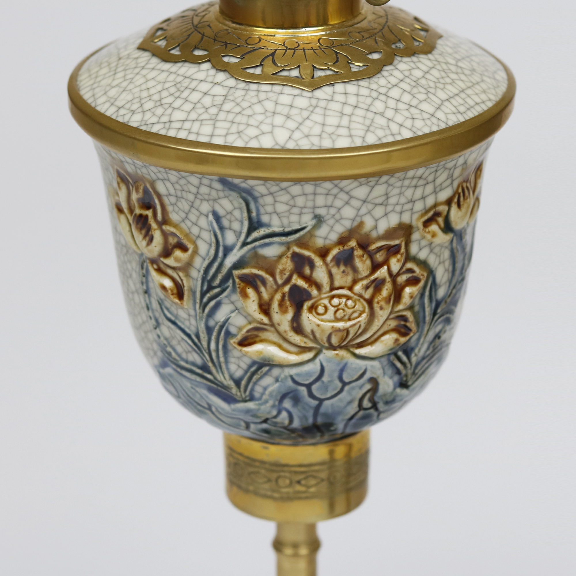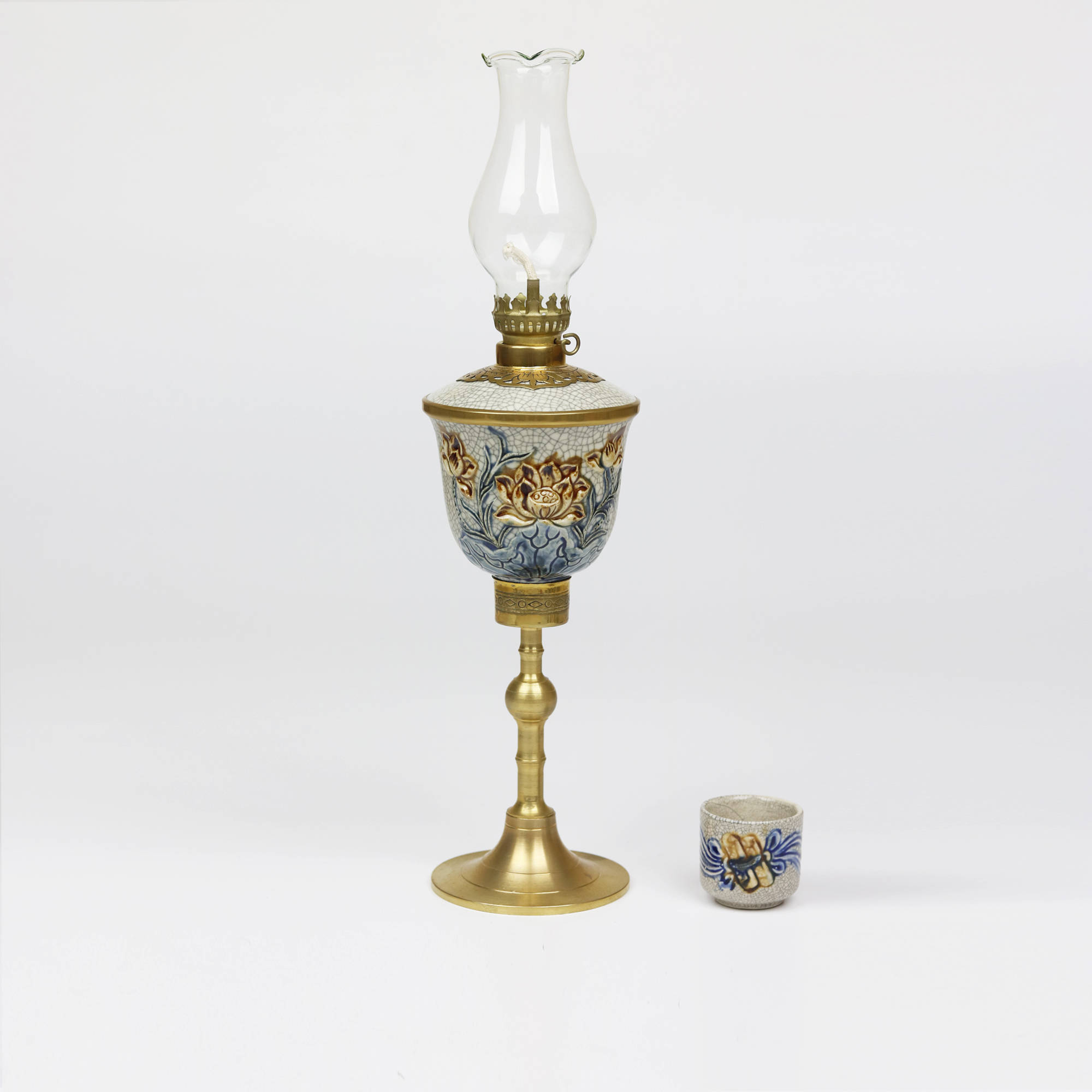 Đèn dầu gốm sứ men rạn Bát Tràng chân đồng đắp nổi hoa sen Từ lâu đèn dầu đã đóng vai trò quan trọng trong văn hóa thờ cúng của người Việt Nam. Chiếc đèn