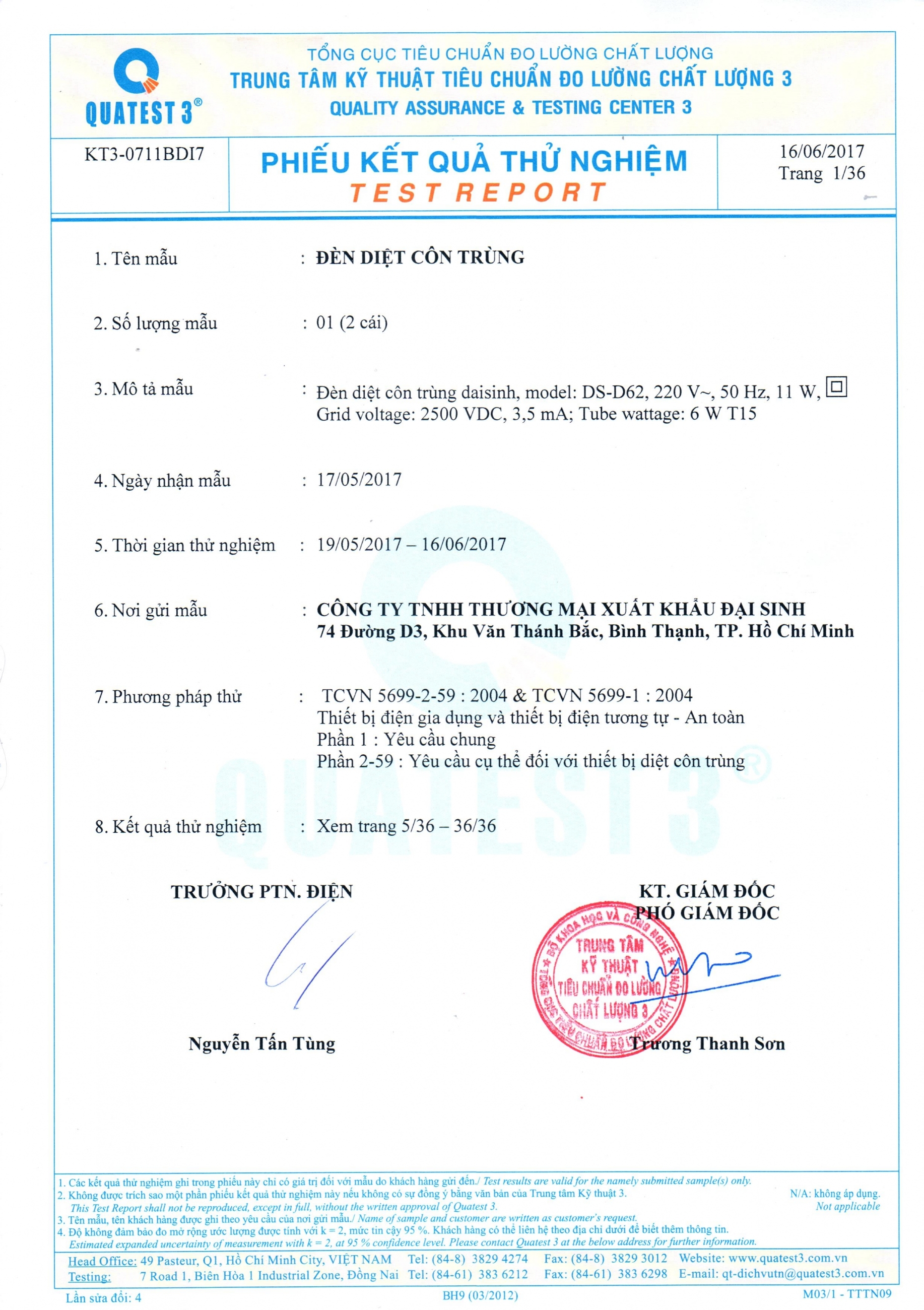 Sản phẩm của Đại Sinh là đơn vị đầu tiên tại Việt Nam được Trung tâm III cấp Giấy chứng nhận an toàn chất lượng về tiêu diệt côn trùng.
