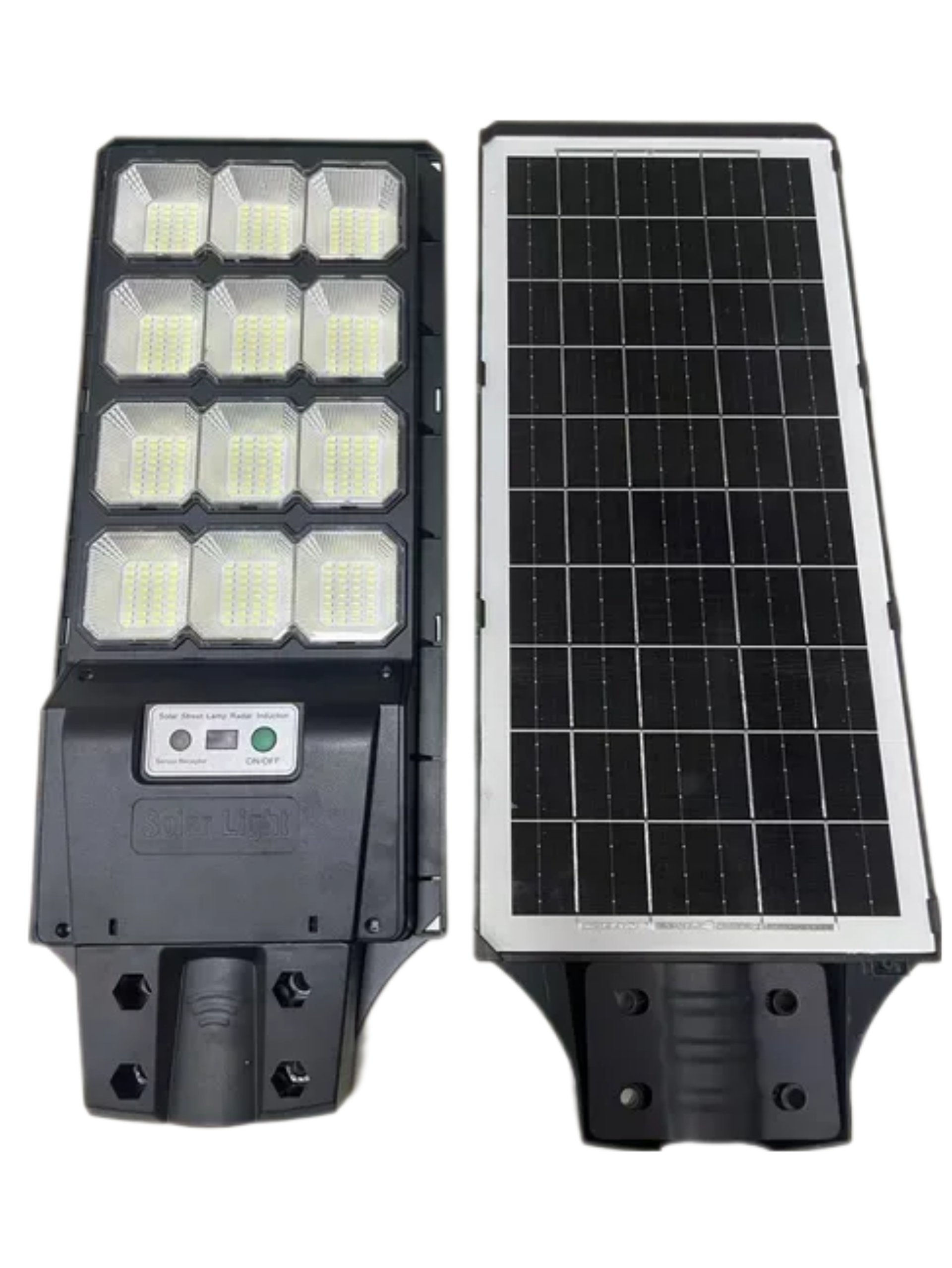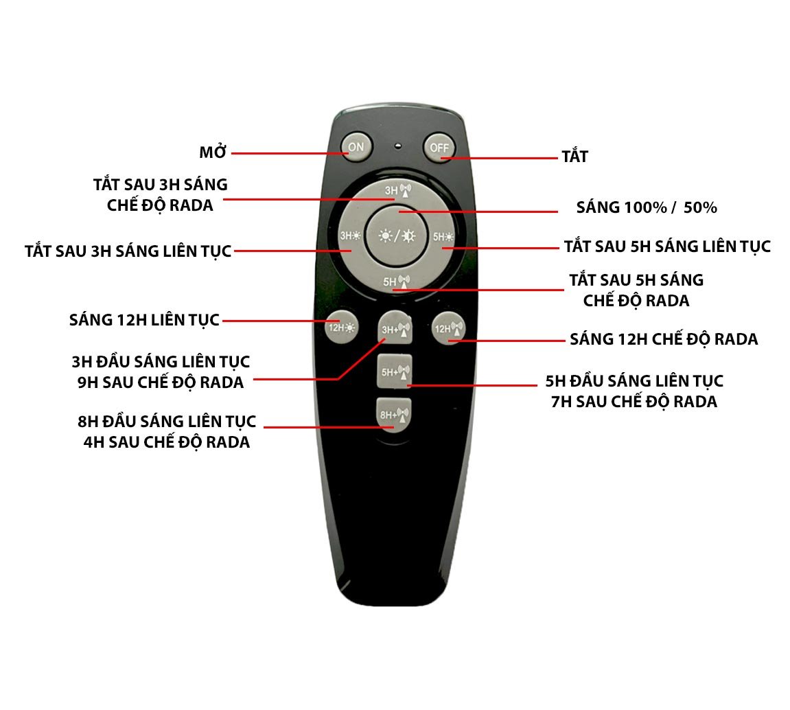 Mô tả sản phẩm : Đèn Đường liền thể 240w Vật liệu vỏ: ABS Kích thước đèn: 57021870mm Kích thước tấm pin 540*240mm ( 6v20w ) Nguồn sáng: 360 hạt LED chip 5730 SMD ( 30 hạt x 12 ô đèn ) Nhiệt độ màu: 6500K ~ 7000K (trắng mát) Chống nước:theo tiêu chuẩn IP67 Cảm biến 2 chế độ chuyển động và sáng thường điều bằng 1 nút bấm trên remote có kèm theo Góc cảm biến: 120 độ Khoảng cách phát hiện và cảm nhận chuyển động: 4-6 mét Thời gian nạp: nắng tốt từ 4-6 giờ Thời gian chiếu sáng: 8 đến 10 tiếng Màu sắc: đen Pin: 12000MAh lithium