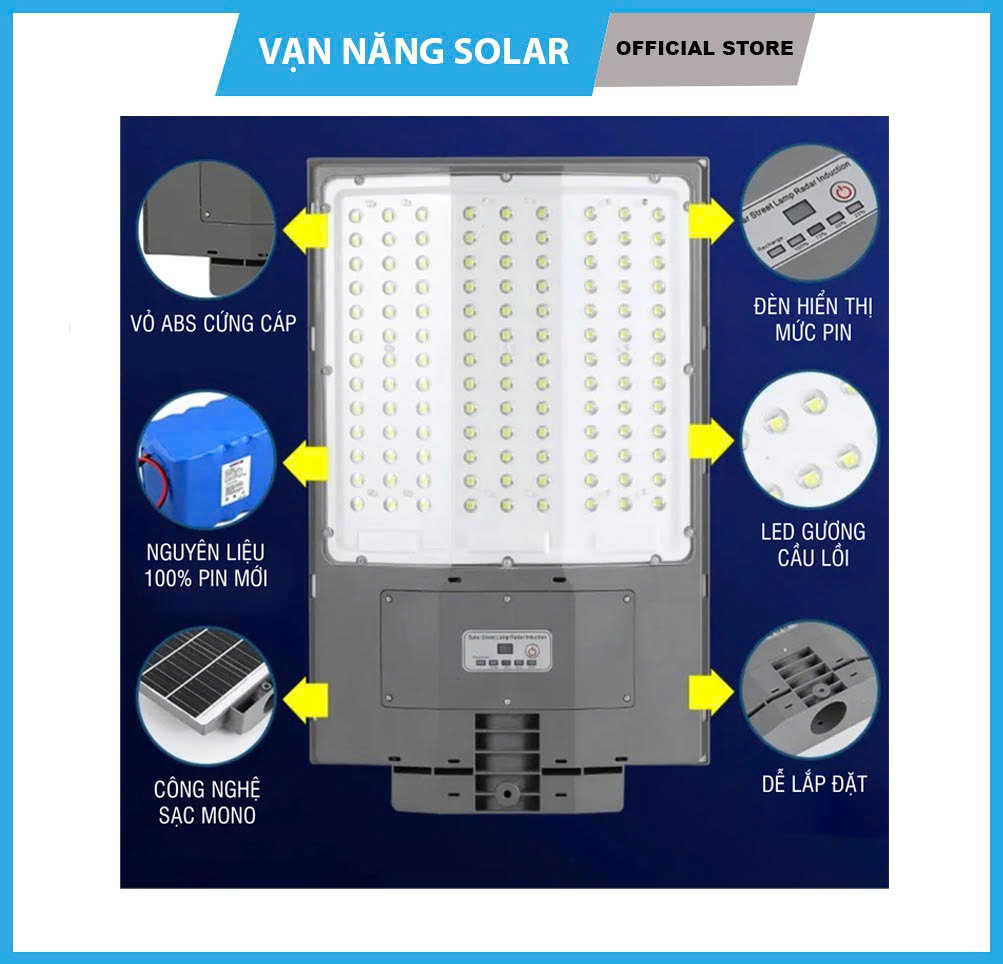 Mua tại TiktokĐèn đường 600W Vật liệu vỏ: nhựa ABS Thời gian nắng để sạc : 6-8h Thời gian chiếu sáng: 8h-12h Điện áp: 6V 30w kích thước đèn :64834072mm kích thước tấm pin mono: 590*335mm Cấu tạo nguồn sáng: 144 hạt led 5054 Chức năng: Cảm biến thường và chuyển động, cài đặt bằng 1 nút bấm trên remote kèm theo Bộ sản phẩm gồm: Thân đèn + chân đèn + pas ốp sau chân đèn + remote + bịt tắc ke,ốc , vít nở