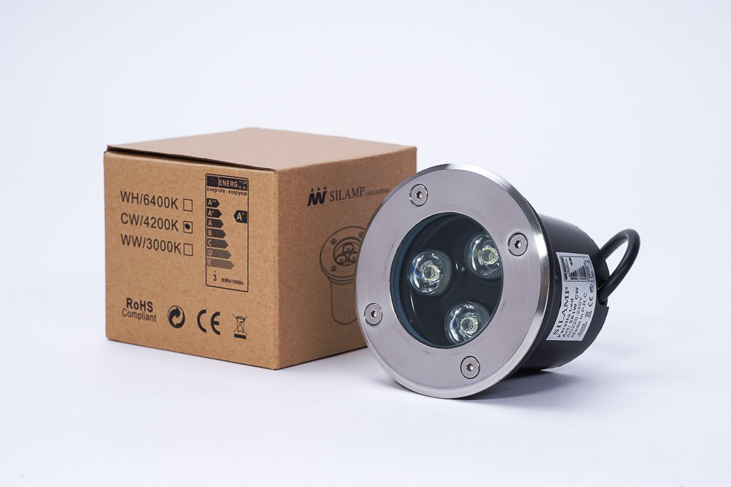 - Đèn LED âm đất Silamp 3W chiếu sáng ngoài trời được gắn âm đất, âm tường, âm lối đi. Thân đèn bằng nhôm đúc, bề mặt kính cường lực 5mm chịu tải trọng lớn. Vành đèn bằng inox sang trọng.