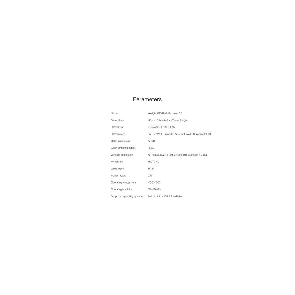 - Phiên bản quốc tế nên tốc độ phản hồi nhanh, firmware ổn định, update thoải mái. THÔNG SỐ KỸ THUẬT: • Tên: Yeelight LED Đèn Ngủ D2 • Số hiệu: YLCT01YL • Loại đèn: Đèn Ngủ, đèn bàn, đèn ngủ • Kích thước: 140mm (đường kính) 100mm (cao) • Định mức đầu vào: 100 - 240V / 50 - 60Hz / 0.1A • Công suất định mức: 5W (61W/LED MODULE (W) + 6*0.5W/LED MODULE (RGB)) • Đèn đầu vào: 5V 1A • Hệ số công suất: 0.45 • Điều chỉnh màu sắc: WRGB • Chỉ số hoàn màu: Ra80 • Kết nối không dây: Wifi IEEE 802.11 B/g/n 2.4GHz và Bluetooth V4.2 BLE • Hệ điều hành hỗ trợ: Android 4.4 hoặc IOS 9.0 trở lên TÍNH NĂNG CHÍNH: