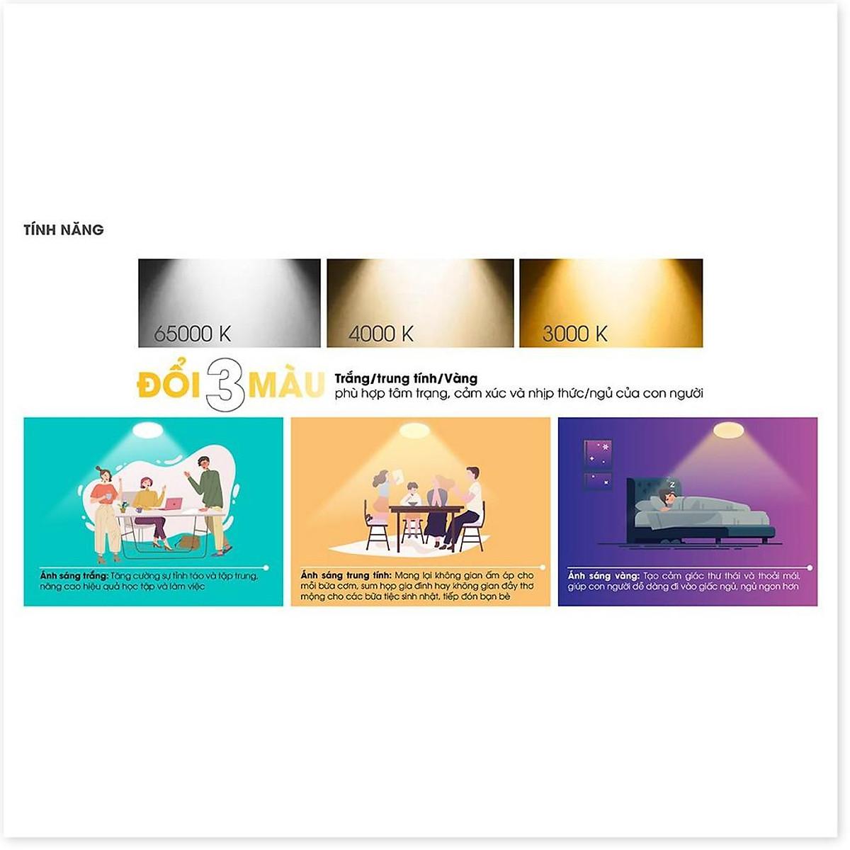 · Công suất đèn: 6W · Ánh sáng: Trắng/Ấm/Vàng đổi 3 màu / 5 mức ánh sáng · Sử dụng Sử dụng Chip LED Samsung đạt độ tin cậy cao · Tiết kiệm đến 90