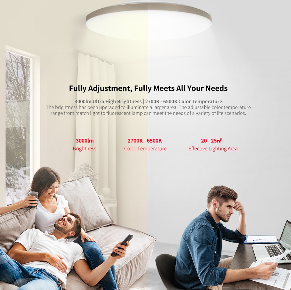 - Chưa kèm Remote Đèn thông minh Cho mọi căn nhà Thiết kế nắp che ánh sáng được cập nhật sử dụng vật liệu acrylic trong suốt và quy trình phim độc đáo, cho phép tạo ra ánh sáng dịu nhẹ mà không chói lóa. Một chiếc đèn trần sẽ làm sáng mọi góc của căn phòng và còn có thể điều chỉnh nhiệt độ và màu ánh sáng theo tâm trạng (3500lm @ 4000K). Đèn ốp trần Yeelight Halo Pro 470 LED Ceiling Light YLXD50YL thông minh chất lượng cao. Đèn ốp trần là một thiết bị chiếu sáng hữu ích và cần thiết trong mỗi gia đình. Hãy nâng cấp chúng lên một phiên bản thông minh và cao cấp hơn với Yeelight. Đèn ốp trần Yeelight Halo 470 có công suất 52W, cường độ sáng: 3500lm – 4000k. Độ sáng này có thể sử dụng cho mọi căn phòng như phòng ngủ, phòng khách khoảng 25m2. Tuy đèn có công suất cao nhưng được thiết kế với bề mặt acrylic trong suốt tạo ra ánh sáng dịu nhẹ mà không chói lóa. Trang bị ánh sáng hắt trần RGB Dòng đèn Halo được trang bị cả ánh sáng chính và ánh sáng hắt trần RGB 16 triệu màu, bạn có thể sử dụng kết hợp để tăng cường môi trường ánh sáng trong phòng hoặc sử dụng riêng biệt với ánh sáng tinh tế hơn để cânbằng tâm trạng. Tương thích cho những cuộc phiêu lưu vào ban đêm của bạn Đèn Halo hỗ trợ chế độ ánh sáng mặt trăng với các sắc thái và độ sáng có thể tùy chỉnh. Một dải thiên hà ở trạng thái ánh sáng mặt trăng là hoàn hảo cho ban đêm vì nó có thể phát ra ánh sáng dịu nhẹ, thoải mái và không chói mắt. Đèn có chỉ số hoàn màu (Ra) lên đến 95, có nghĩa là nó có thể hiển thị chính xác đến 95% màu ánh sáng mặt trời tự nhiên và nhìn thế giới sống động như vốn có. Nhiệt độ màu có thể điều chỉnh cho các mục đích sử dụng khác nhau Tùy chỉnh nhiệt độ màu của bạn từ 2700K đến 6500K. Các màu dưới 3200K phát ra ánh sáng ấm áp, 3300K-5300K hiển thị ánh sáng trung tính cho tâm trạng dễ chịu và thanh thản, trên 5300K hiển thị ánh sáng mát để giúp mọi người tập trung. Các nhiệt độ màu khác nhau này giúp điều chỉnh ánh sáng phù hợp với từng mục đích sử dụng, từ đèn ngủ cho đến đèn làm việc/học tập. Đèn Yeelight Halo áp dụng thiết kế nhiều lớp cho vỏ đèn của mình. Nó sẽ vẫn sáng bóng và rõ ràng do có thể ngăn chặn bụi và côn trùng tích tụ trong ánh sáng. Tương thích với Apple Siri, Mijia App, Google Home, Amazon Alexa dễ dàng điều khiển đèn bằng giọng nói hoặc điện thoại thông minh của bạn. Chỉ một chạm hoặc ra lệnh có thể thay đổi nhiệt độ màu/ cường độ sáng ngay khi bạn đã nghỉ ngơi trên chiếc giường của mình.