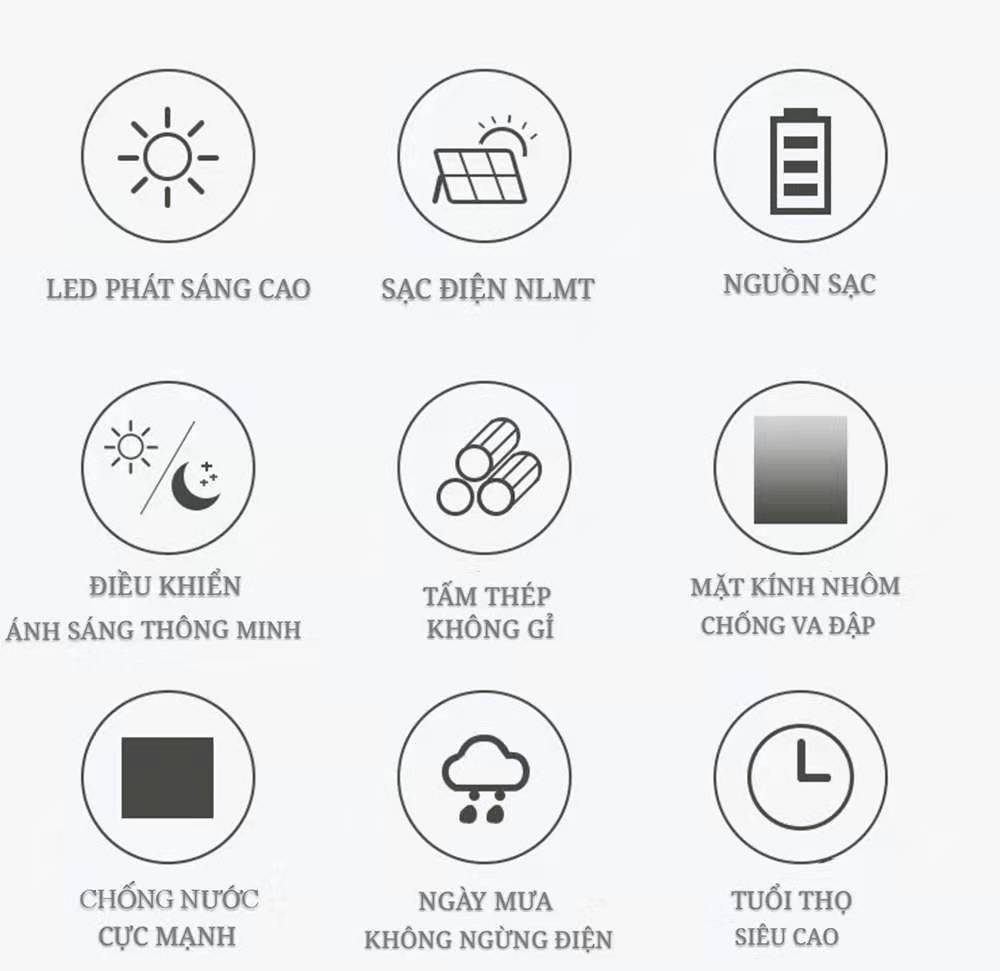 - Độ bền cao: Sản phẩm được trang bị chuẩn chống nước IP67, chống sét TVS, không phát nhiệt gây bỏng như đèn điện thông thường. Đặc Tính sản phẩm: