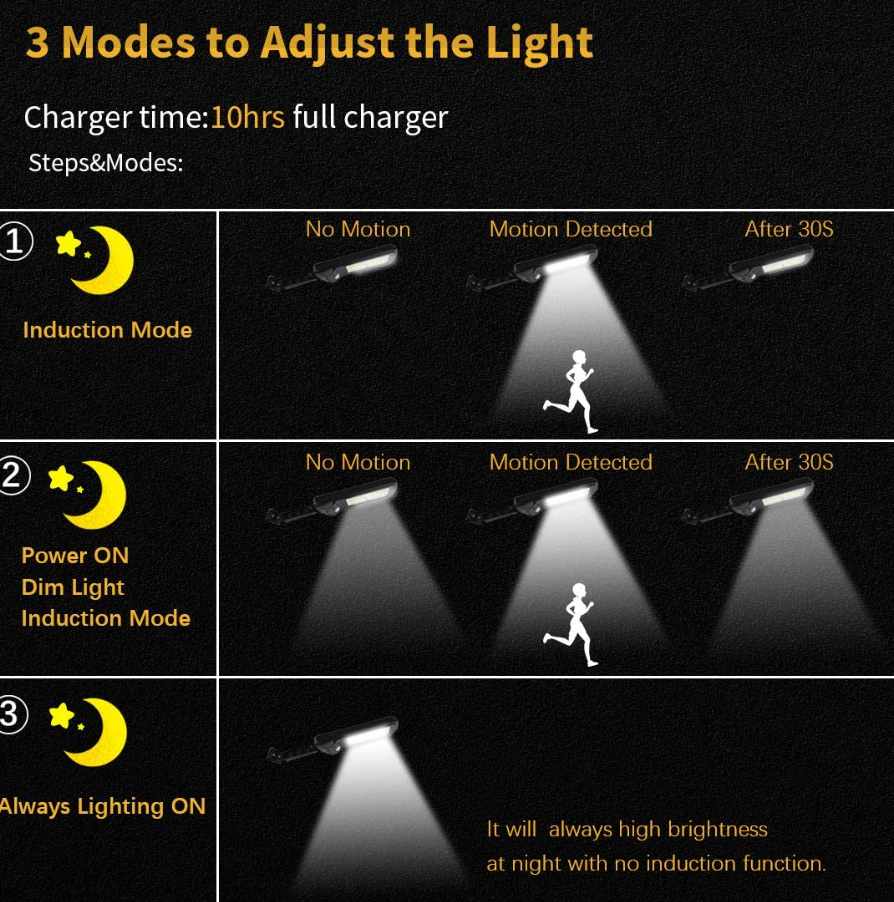 Cảm biến ánh sáng: tự động sạc Pin khi có ánh nắng mặt trời vào ban ngày. Chế độ sáng thông minh khi ít điện hoặc mưa liên tục sẽ giảm điện tiêu thụ về đêm khuya để tiết kiệm điện. Cảm biến chuyển động: tự động sáng mạnh khi phát hiện chuyển động vào ban đêm. Thời gian nắng để sạc : 6 - 8h Thời gian sáng có thể dùng : 8-12 giờ Ứng dụng: Chiếu sáng sân vườn, hàng rào, tường nhà, ban công ngoài trời, chiếu sáng trong nhà, chống trộm Đèn LED năng lượng mặt trời liền thể 60w (cảm biến chuyển động, cảm biến ánh sáng - Solar Lights Outdoor Motion Sensor) Thông tin chi tiết Độ sáng: Chế độ phát sáng cao      Màu sắc ánh sáng: Ánh sáng trắng    Sử dụng chip LED COB siêu sáng, độ bền cao Pin năng lượng mặt trời : Polycrystalline 3.7V   Công suất tấm pin năng lượng Polysilicon: 15W Điện áp, loại pin sử dụng : Li-ion 2200mAh        Thời gian nắng để sạc : 6 - 8h        Hoạt động: tự động sạc Pin khi có ánh nắng mặt trời vào ban ngày, bật sáng đèn khi phát hiện chuyển động vào ban đêm.        Khoảng cách cảm biến chuyển động: 3-5m Thời gian sáng có thể dùng: 8-12 giờ (tùy vào cường độ chiếu sáng bằng ánh sáng vừa hay ánh sáng mạnh) Ứng dụng: Chiếu sáng sân vườn, hàng rào, tường nhà, ban công ngoài trời, chiếu sáng trong nhà, chống trộm Vật liệu chính: nhựa ABS + PC         Thời gian sáng: thiết kế sáng từ lúc trời tối (khoảng 6h tối) đến sáng. Chức năng cảm biến ánh sáng tự động sáng tắt và cảm biến vi sóng chuyển động Chế độ sáng thông minh khi ít điện hoặc mưa liên tục sẽ giảm điện tiêu thụ về đêm khuya để tiết kiệm điện.  Cấu tạo: gồm có mặt trên là tấm pin mặt trời, một hộp bên trong chứa mạch điều khiển kỹ thuật số và sử dụng pin Lithium với độ bền cao, mặt dưới là 6 bộ đèn Led chip COB. Khung đèn có thể bắt vào tường hoặc trụ dễ dàng.  Có thể cài đặt có điều khiển ( remote) Sản phẩm này là tài sản cá nhân được bán bởi Nhà Bán Hàng Cá Nhân và không thuộc đối tượng phải chịu thuế GTGT. Do đó hoá đơn VAT không được cung cấp trong trường hợp này.