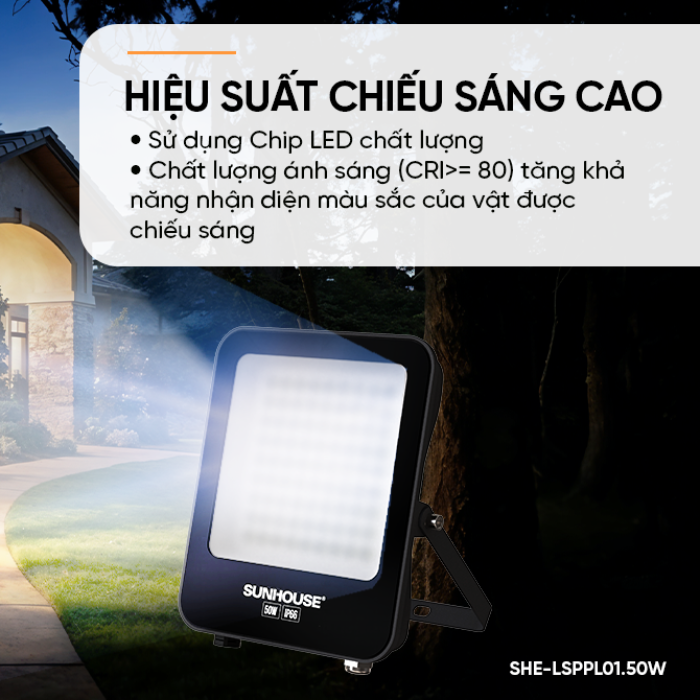 ✨Đèn pha LED SUNHOUSE Spec SHE-LSPPL01.50W Sử dụng Chip LED ,Tuổi thọ 25.000 giờ, chuẩn IP66, chống nước