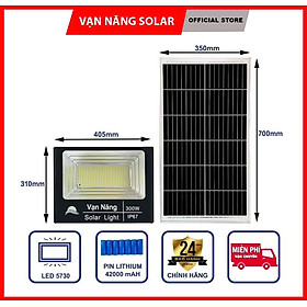 Thông số kỹ thuật Đèn pha Vạn Năng 300W • 650 hạt led to loại 5730 • Vỏ đèn hợp kim nhôm + kính cường lực • Thời gian chiếu sáng trên 12h liên tục • PIN: 42000mAh Li-Pin • Kích thước đèn: 40531085mm • Kích thước tấm pin: 67035017mm