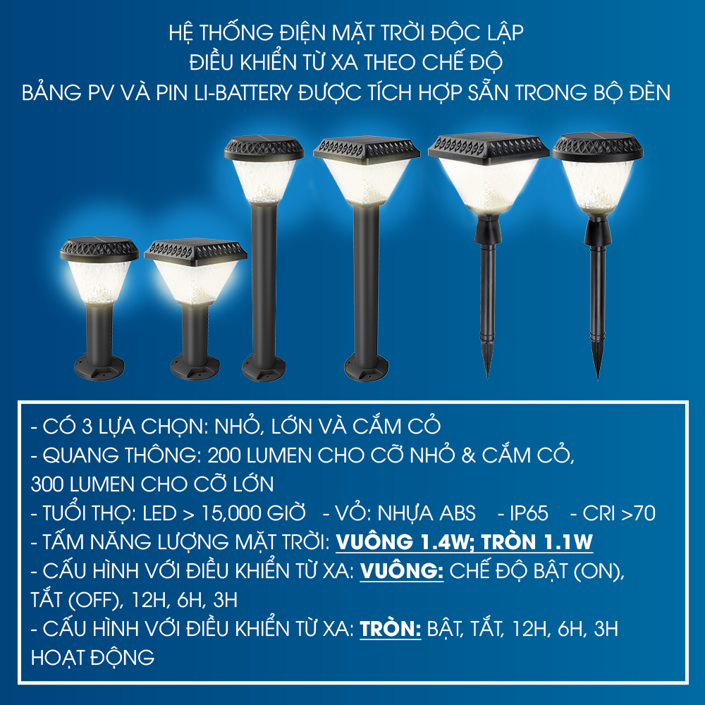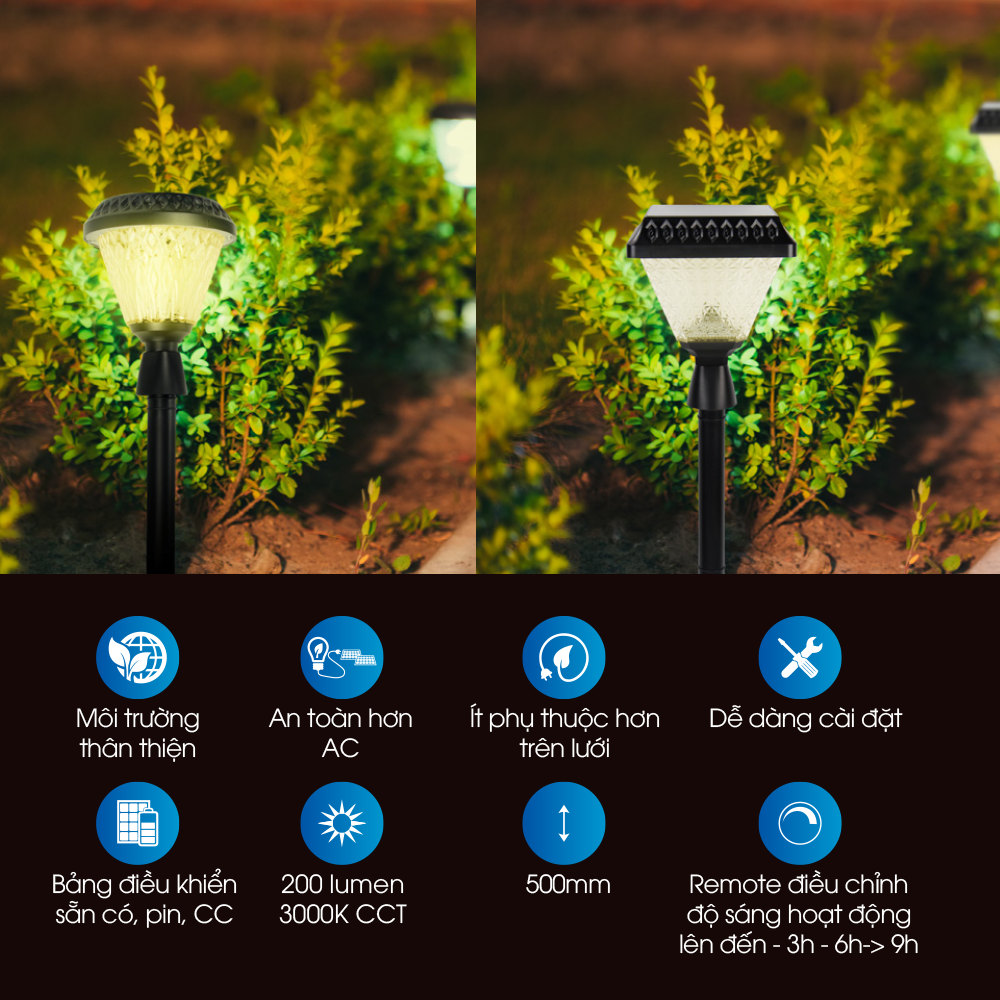 Đèn sân vườn Philips Deco solar spot BGC050 có những hình dạng RS (tròn nhỏ), RL (tròn lớn), R Spike (đinh tròn), SS (tròn nhỏ), SL (tròn lớn), S Spike (đinh tròn), chạy bằng năng lượng mặt trời rất lý tưởng để thắp sáng ngôi nhà và khu vườn của bạn. Thông minh và phong cách, đèn cắm cỏ Philips Deco dễ dàng lắp đặt để tiếp cận với nguồn ánh sáng mặt trời, tiêu thụ ít điện năng và bền bỉ.   Điểm đặc biệt • Dùng để chiếu sáng ngoài trời nơi hạn chế nguồn điện • Cấu hình dễ dàng sử dụng theo nhu cầu người dùng • Tất cả các phụ kiện đi kèm trong cùng 1 hộp, có thể tự lắp đặt • Điện áp thấp, an toàn khi sử dụng   Lý do chọn sản phẩm • Hệ thống điện mặt trời độc lập • Điều khiển từ xa theo chế độ • Bảng PV và pin Li-battery được tích hợp sẵn trong bộ đèn   Thông số kỹ thuật chính • Có 3 lựa chọn: nhỏ, lớn và cắm cỏ • Quang thông: 200 lumen cho cỡ nhỏ & cắm cỏ, 300 lumen cho cỡ lớn • Màu ánh sáng: 3000K - Ánh sáng vàng • Tuổi thọ: LED > 15,000 giờ - Vỏ: Nhựa ABS - IP65 - CRI >70 • Tấm năng lượng mặt trời: VUÔNG 1.4W; TRÒN 1.1w • Cấu hình với điều khiển từ xa: VUÔNG: chế độ Bật (On), Tắt (Off), 12H, 6H, 3H • Cấu hình với điều khiển từ xa: TRÒN: Bật, Tắt, 12h, 6h, 3h hoạt động