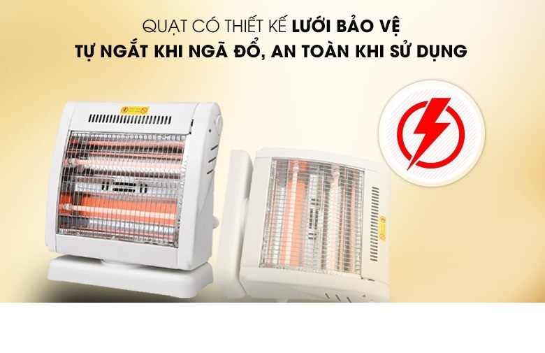 - Tự động ngắt điện khi quạt bị nghiêng hay đổ Đèn Sưởi Điện 2 Bóng Halogen 800W Xoay 90 Độ - Hàng Chính Hãng là một trong những thiết bị sưởi ấm không thể thiếu tại gia đình trong mùa đông. Sản phẩm sử dụng đèn Halogen, tỏa nhiệt đều, làm ấm nhanh, không gây khó thở và khô da, đảm bảo an toàn cho người sử dụng. Kiểu dáng sang trọng, hiện đại Đèn Sưởi Điện 2 Bóng Halogen 800W Xoay 90 Độ - Hàng Chính Hãng có thiết kế sang trọng hơn, kiểu dáng hiện đại và bắt mắt, nhỏ gọn tiết kiệm diện tích và phù hợp mọi không gian như phòng khách, phòng ngủ, Điều khiển dễ dàng bằng nút xoay Đèn Sưởi Điện 2 Bóng Halogen 800W Xoay 90 Độ - Hàng Chính Hãng có 3 mức công suất 400W, 800W điều chỉnh bằng núm vặn linh hoạt theo 2 chiều giúp bạn dễ dàng lựa chọn được mức nhiệt phù hợp với môi trường và nhu cầu sử dụng. Chắc chắn, bền đẹp, an toàn Đèn Sưởi Điện 2 Bóng Halogen 800W Xoay 90 Độ - Hàng Chính Hãng có chân đế vững chãi, lưới bảo vệ, tránh gây bỏng cho người dùng. Đặc biệt, lồng và vỏ nhựa phía sau chống cháy tuyệt đối, lưới tản nhiệt giúp sản phẩm không bị hư hỏng do quá nóng. TỎA NHIỆT ĐỀU, KHÔNG GÂY KHÔ DA Làm ấm cực nhanh, không gây khô da Đèn Sưởi Điện 2 Bóng Halogen 800W Xoay 90 Độ - Hàng Chính Hãng sử dụng đèn halogen, làm ấm cực nhanh, độ bền vượt trội, chống chói mắt hiệu quả và không đốt cháy oxy nên không gây khó thở hay khô da khi dùng. Quay đảo chiều, tỏa nhiệt đều khắp phòng Sản phẩm có khả năng quay đảo chiều liên tục, giúp tỏa nhiệt đều khắp phòng, rất thích hợp khi sử dụng tại không gian rộng như phòng khách hoặc phòng có nhiều người. An toàn với người sử dụng Đèn Sưởi Điện 2 Bóng Halogen 800W Xoay 90 Độ - Hàng Chính Hãng có chế độ tự động ngắt điện khi bị nghiêng đổ và hoạt động trở lại bình thường trở lại trạng thái an toàn. Thông số kỹ thuật