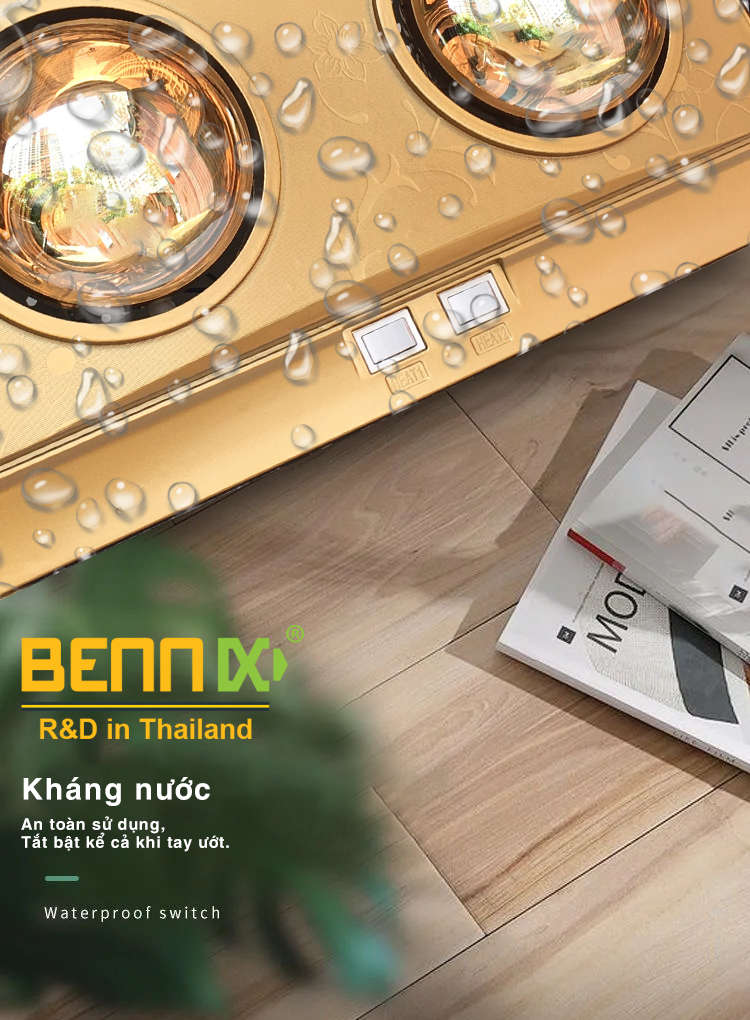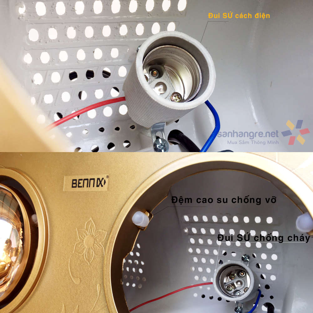 - Thiết kế kháng nước, an toàn khi sử dụng Đèn sưởi nhà tắm 2 bóng Bennix BN-02G có thiết kế kháng nước phù hợp sử dụng ở nơi có độ ẩm cao như nhà tắm. Đảm bảo an toàn khi sử dụng, không chập cháy. Vỏ nhựa bao quanh đèn là nhựa ABS cách điện. Cùng với đó phần đui đèn được bọc lớp vỏ sứ cách điện rất tốt. Phần thân đèn có thiết kế rất khít, tránh nước có thể chảy vào bộ phận điện bên trong.