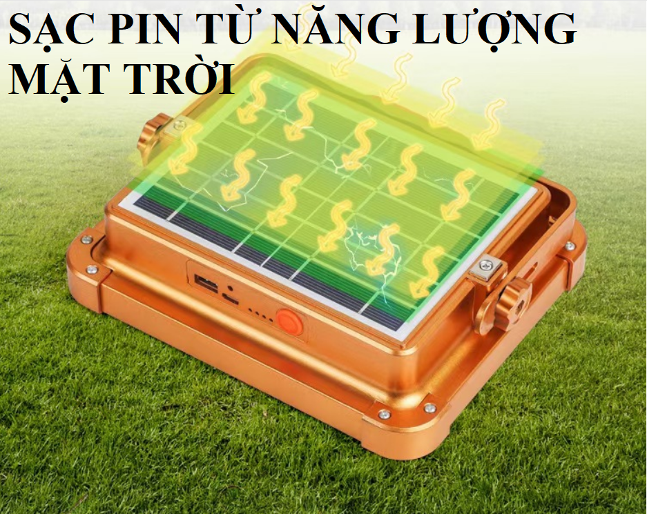 - Có thể sạc bằng năng lượng mặt trời hoặc qua cốc sạc điện thoại qua cổng Typec sạc nhanh
