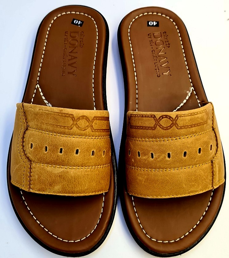 Dép quai ngang nam da bò 100%, quai 02 lớp da Bò Donavy cao cấp may full quai và đế rất chắc chắn DONAVY1MC Chất liệu: Da bò thật 100% da bò tự nhiên Đế cao su tốt đi siêu êm, chống chơn, trượt. Da được may vào đế cẩn thận, đẹp bao đi nước Hàng đảm bảo giống hình