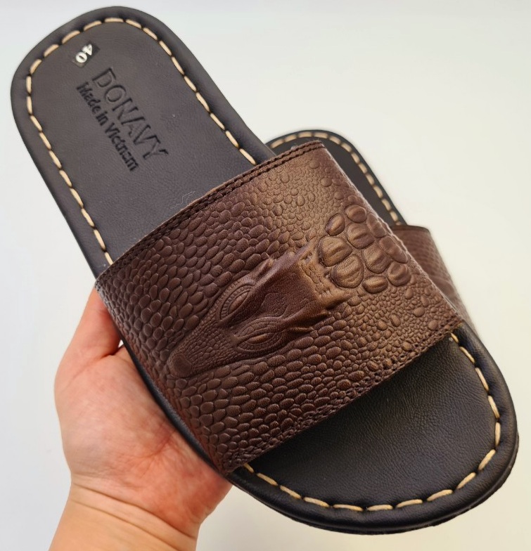 Dép Quai Ngang Nam Da Bò Thật 100%,DONAVY Kiểu Đầu Cá Sấu Đi Rất Nhẹ Và Êm DCSDN Chất liệu: Da bò thật 100% da bò tự nhiên Đế cao su tốt đi siêu êm, chống chơn, trượt. Da được may vào đế cẩn thận, đẹp bao đi nước Hàng đảm bảo giống hình