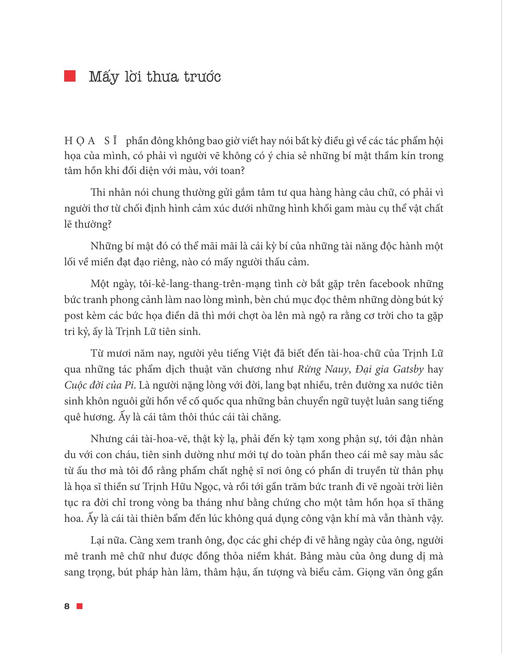 Những tự vấn ấy len lỏi vào lời, vào tranh, lời nào, tranh nào cũng đầy bồi hồi, tha thiết. Từ mối “giao cảm” của tác giả với cảnh, mà ta nghe ra mối giao cảm của ta với tác giả. Vậy nên, cuốn sách này của Họa Sĩ Trịnh Lữ, vẽ cảnh nước người mà cái tâm tình thì gần gũi... Đọc những lời Trịnh Lữ viết, xem tranh Trịnh Lữ vẽ, bạn đọc hẳn bao giờ cũng sẽ có cảm giác ngồi xuống, uống trà, xem tranh, trò chuyện thân tình…