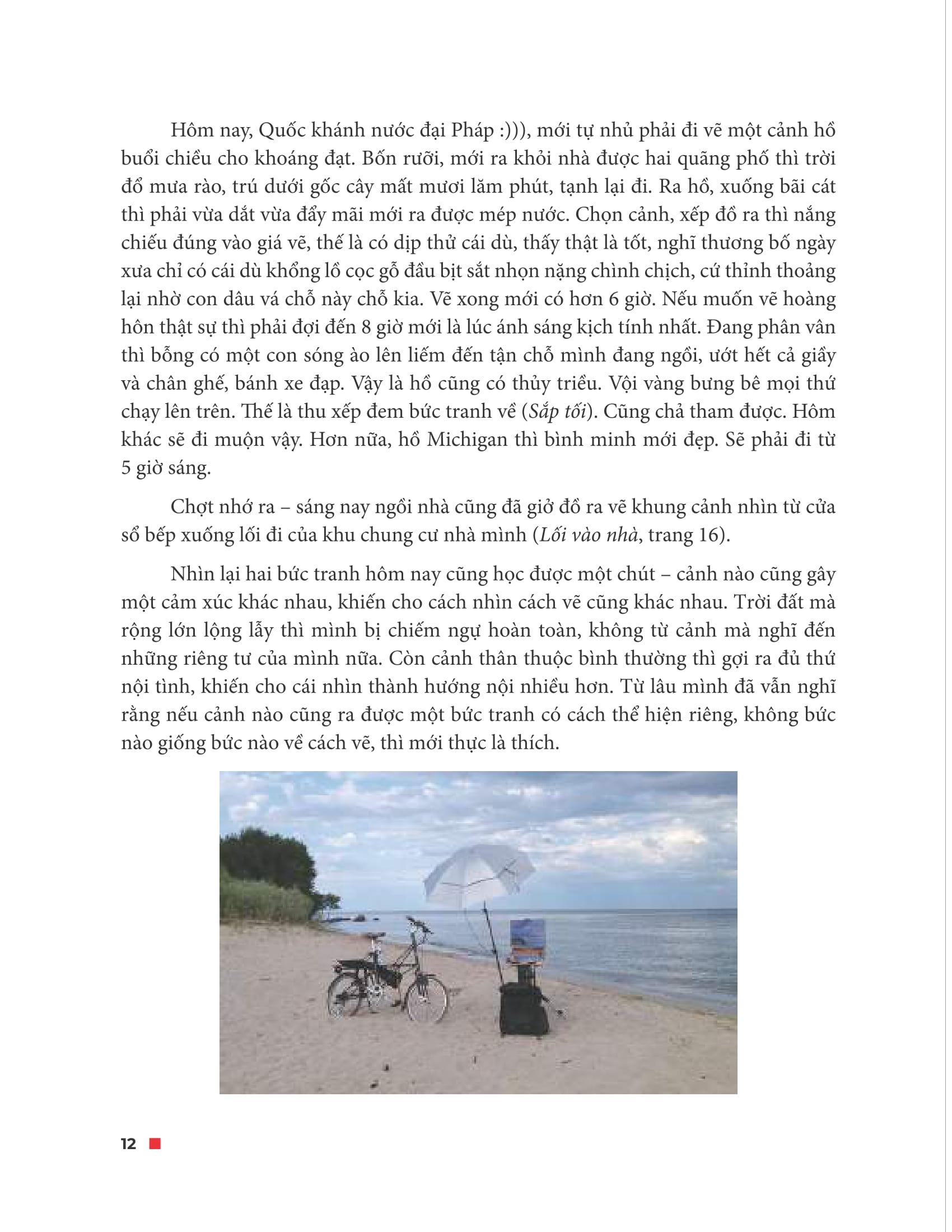 “Càng xem tranh ông, đọc các ghi chép đi vẽ hằng ngày của ông, người mê tranh mê chữ như được đồng thỏa niềm khát. Bảng màu của ông dung dị mà sang trọng, bút pháp hàn lâm, thâm hậu, ấn tượng và biểu cảm. Giọng văn ông gần9 gũi, nhẹ nhàng, giàu thi tính, khiến người đọc thấy như đang được rong ruổi xe đạp cùng ông, dựng giá vẽ bên lối mòn trong rừng hay ngồi phệt xuống đâu đó bên vệ cỏ một chiều ẩm ướt, nghe ông thủ thỉ chuyện đời trong khi chứng kiến những nét thiên nhiên hiện dần lên dưới tay bút kỳ tài. Tranh ông vẽ đất khách người dưng mà sao không thấy xa lạ cảnh sắc hay cách trở nhân tình. Thế giới phẳng bây giờ đâu cũng là nhà chăng? Bài ký nào, bức họa nào cũng mộc như cái tình chân thành của người nghệ sĩ yêu đất, yêu trời, yêu đời, yêu người, rủ rỉ một m.ình, mà sao khiến người đọc dễ lây đến thế cái an nhiên tự tại.” (Phạm Long, tr. 8-9)