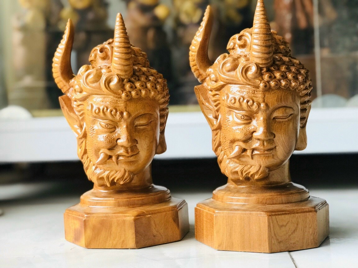 Tượng mặt phật thiện ác chất liệu gỗ bách xanh nguyên khối
