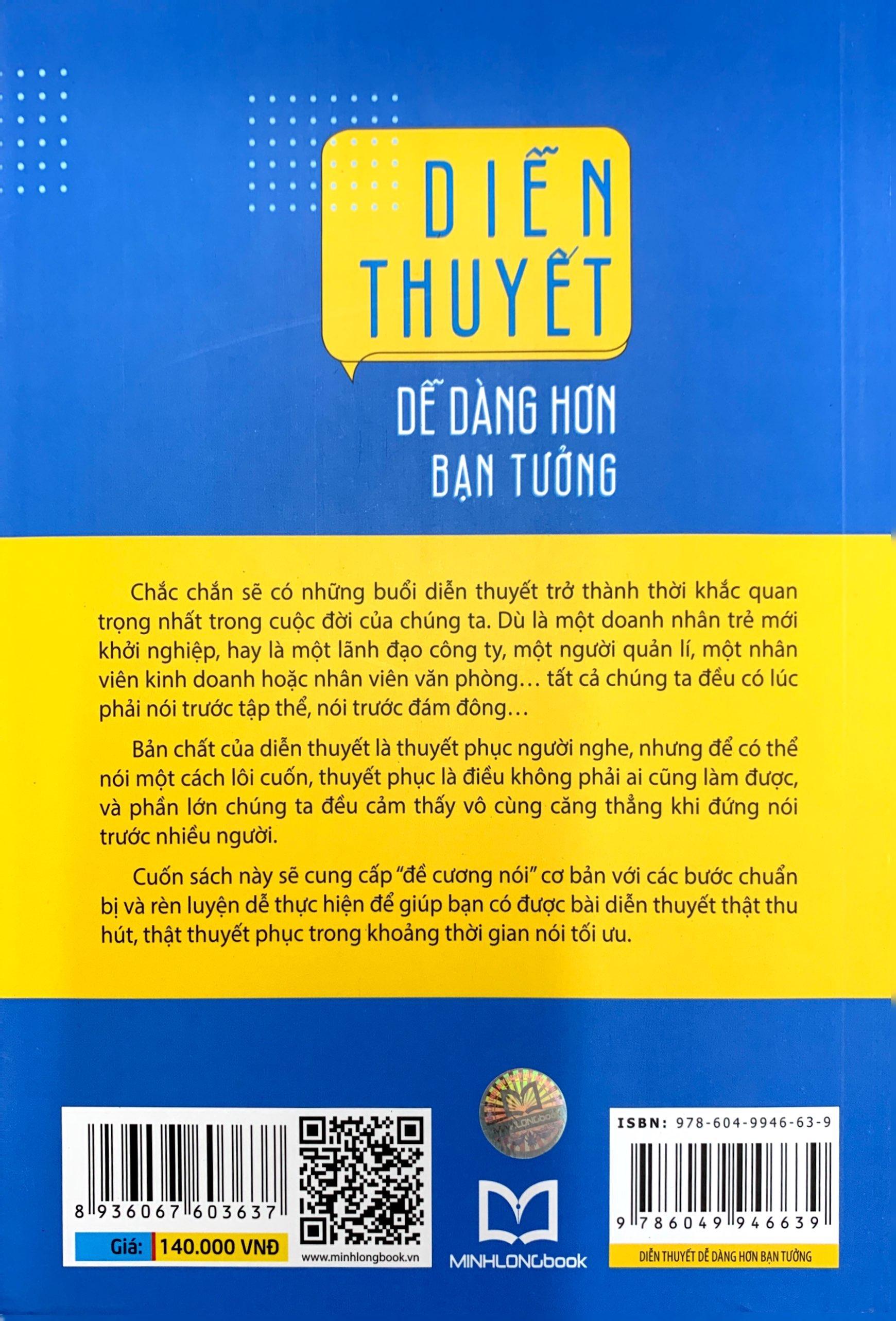 Cuốn sách Diễn Thuyết Dễ Dàng Hơn Bạn Tưởng sẽ cung cấp “đề cương nói” cơ bản với các bước chuẩn bị và rèn luyện dễ thực hiện để giúp bạn có được bài diễn thuyết thật thu hút, thật thuyết phục trong khoảng thời gian nói tối ưu.