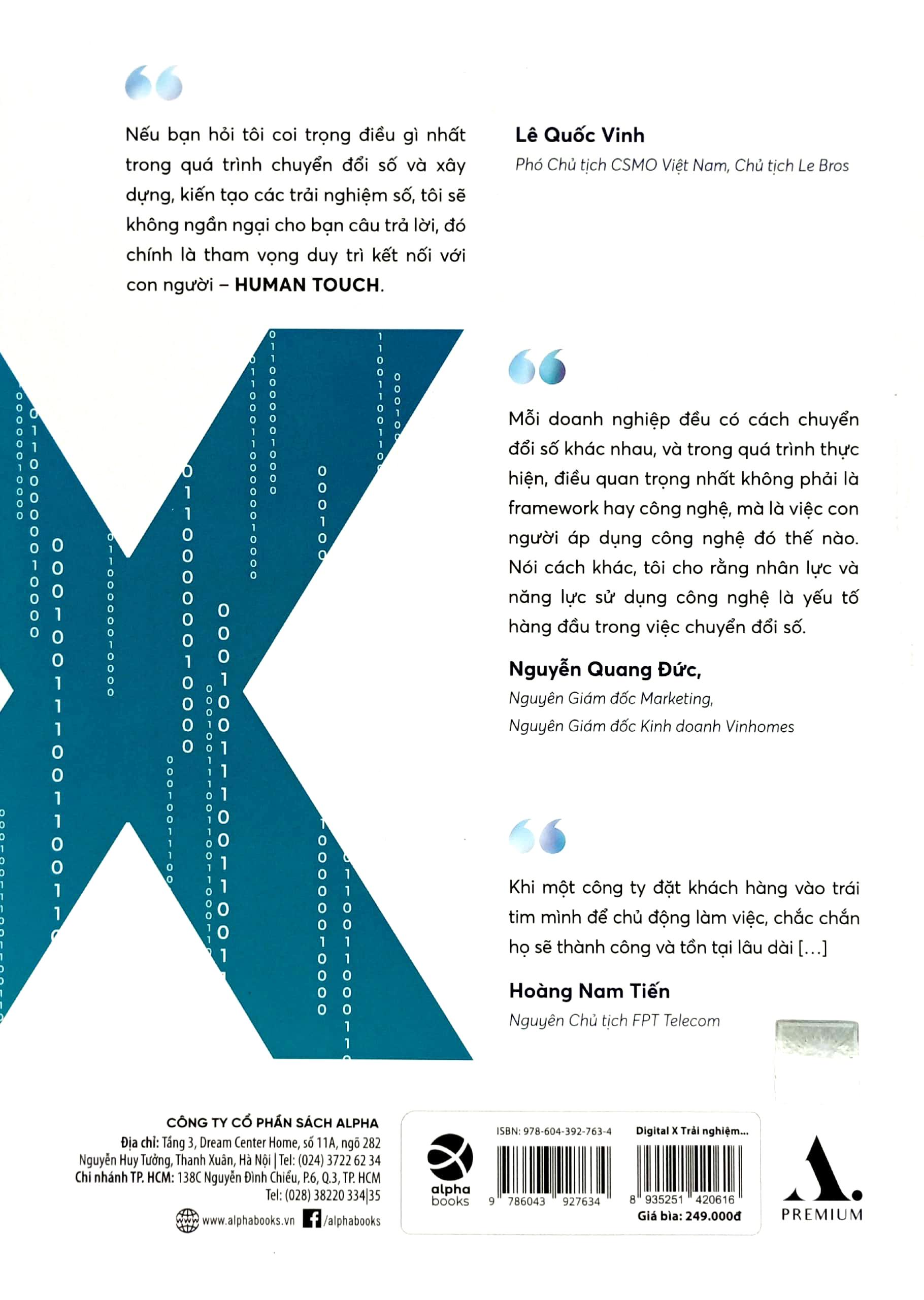 Cuốn sách "Digital X - Trải nghiệm số trong chiến lược Sales & Marketing" sẽ dẫn bạn vào hành trình khám phá mọi "ngóc ngách", khía cạnh về trải nghiệm số với bốn phần chính, cung cấp những thông tin cơ bản, thiết thực và cập nhật giúp người đọc hiểu rõ hơn về nền kinh tế trải nghiệm, cách tạo ra trải nghiệm số tốt nhất cho khách hàng, và cách áp dụng công nghệ (đặc biệt là những công nghệ tiên phong) để tối ưu hóa chiến lược sales và marketing của doanh nghiệp trong thời đại số