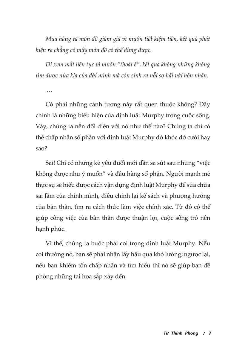 Tuy nhiên, định luật Murphy mang tính cảnh tỉnh và dẫn dắt rất lớn trong cuộc sống hằng ngày. Cuốn sách này giới thiệu đến với bạn đọc về kiến thức cơ bản, hiện tượng thường gặp cùng với các hiệu ứng tâm lý học biểu hiện trong ý thức cá nhân, tính cạnh tranh, quan hệ xã hội,… của định luật Murphy thông qua góc nhìn thực tiễn. Từ đó giúp bạn đọc hiểu được bản chất con người, bản chất xã hội rồi ứng dụng nó vào giải quyết các vấn đề gặp phải trong cuộc sống .