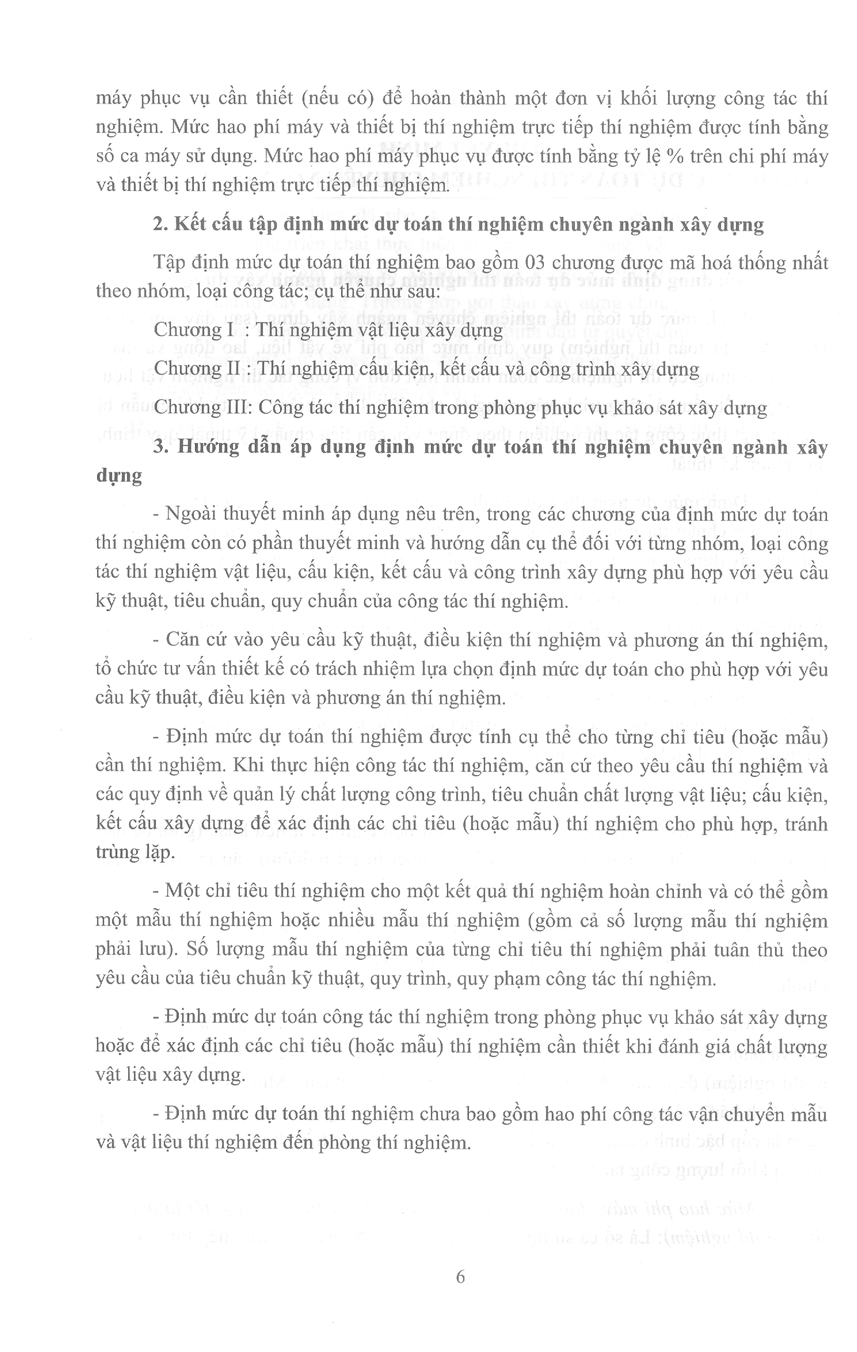 Ngoài thuyết minh áp dụng nêu trên, trong các chương của định mức dự toán thí nghiệm còn có phần thuyết minh và hướng dẫn cụ thể đối với từng nhóm, loại công tác thí nghiệm vật liệu, cấu kiện, kết cấu và công trình xây dựng phù hợp với yêu cầu kỹ thuật, tiêu chuẩn, quy chuẩn của công tác thí nghiệm.