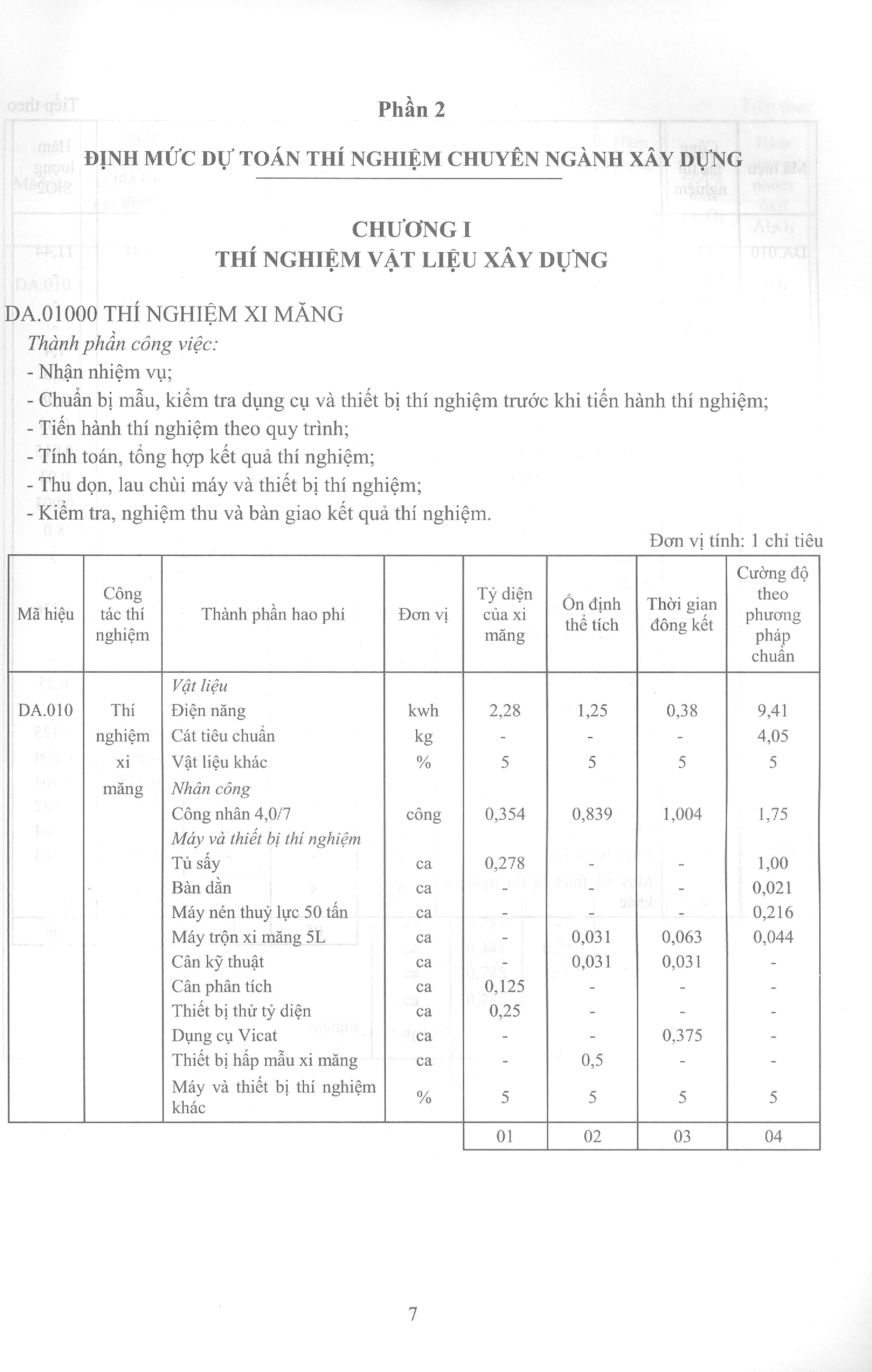 Định mức dự toán thí nghiệm bao gồm: mã hiệu, tên công tác, đơn vị tính, thành phần công việc, quy định áp dụng (nếu có) và bảng các hao phí định mức; trong đó: