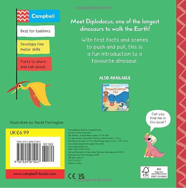 Bright, bold illustrations by David Partington bring Diplodocus and her dinosaur friends to life. With lots to talk about on every page and fun facts to share too, this is the perfect first introduction for inquisitive toddlers to a favourite dinosaur.