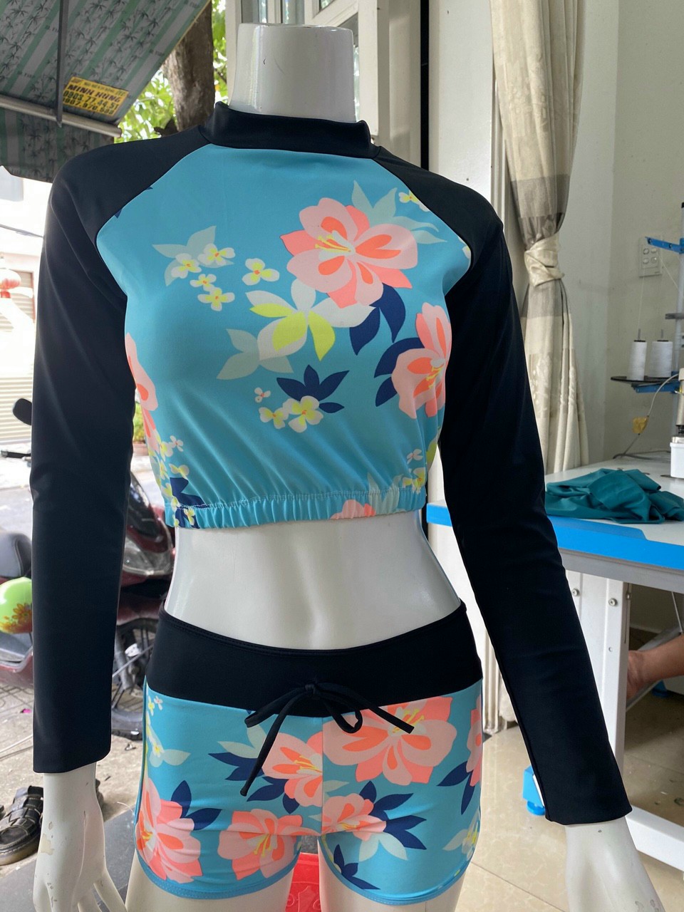 Set Đồ Bơi Nữ Rời Đùi Dài Tay Đi Biển Đi Bơi Chất liệu Polyester 95%, mật độ dệt vừa Áo có sẵn lớp đệm, hông áo có thể rút lên làm croptop cá tính