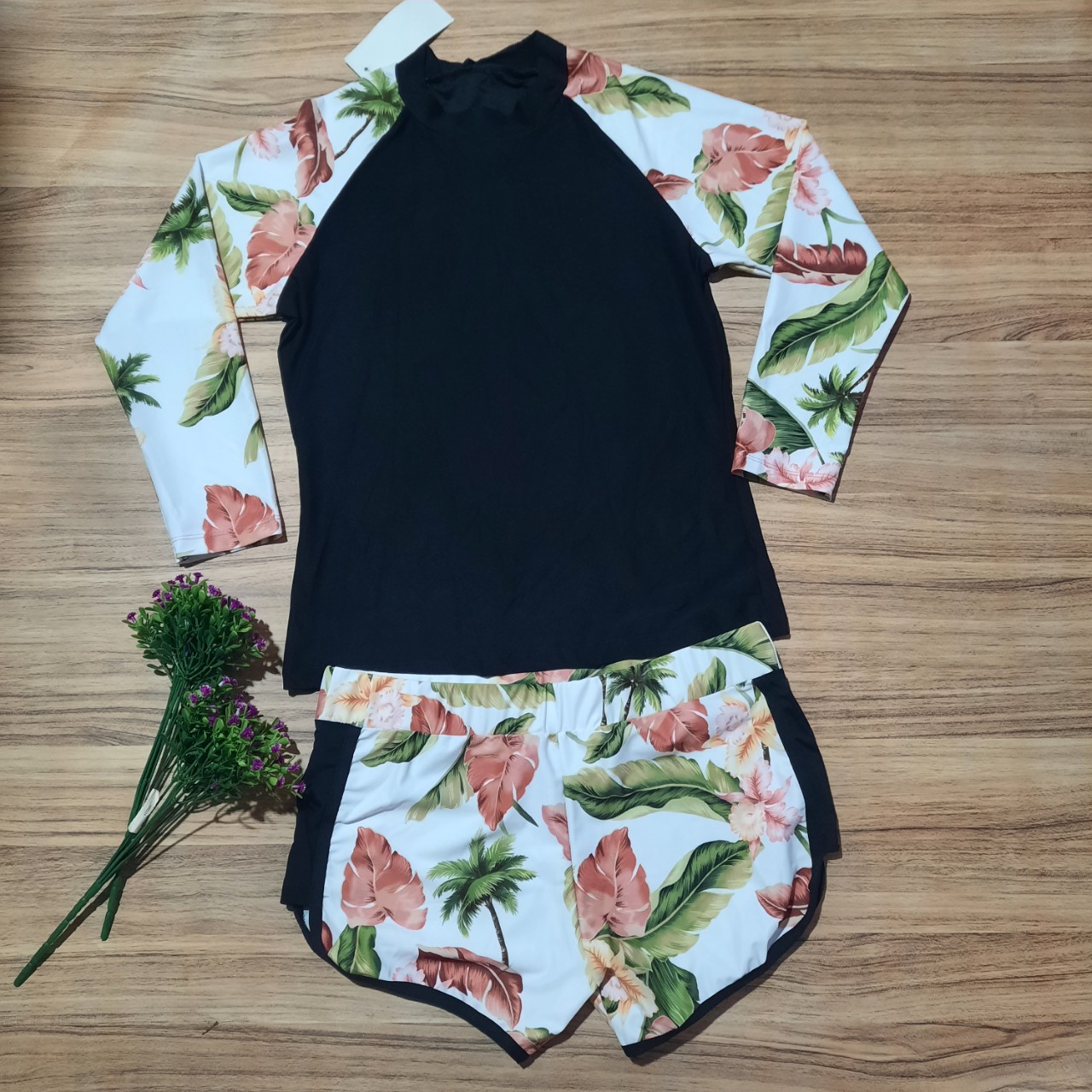 - Mẫu đồ bơi mới nhất cho các bạn nữ thích sự trẻ trung kín đáo mà vẫn thu hút khi đi biển, đi bơi. - Áo dáng ngắn tay phối hoạ tiết trẻ khoẻ,