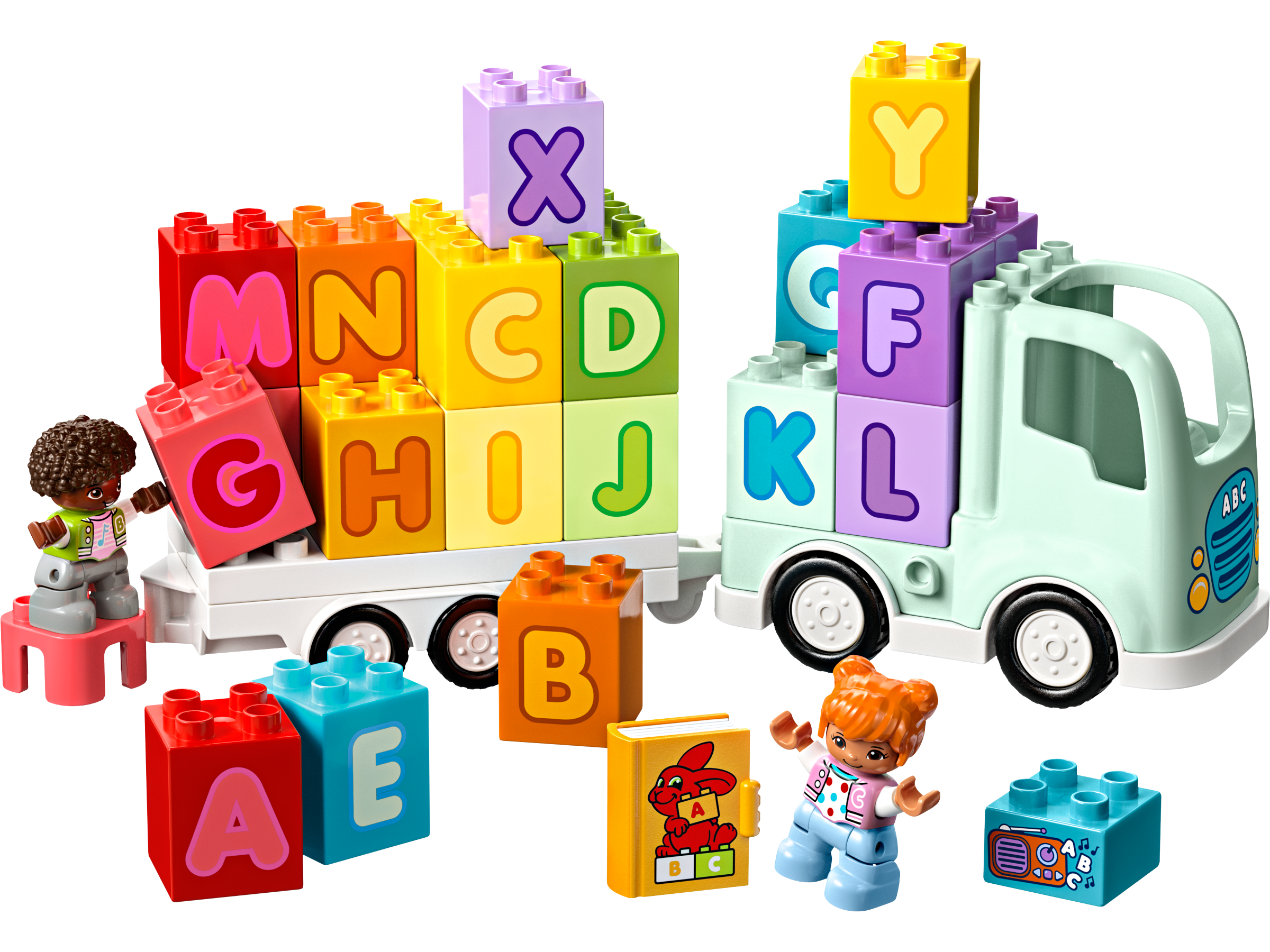 • Đồ chơi xây dựng dành cho trẻ mầm non – Bao gồm một chiếc xe kéo có thể tháo rời, 2 nhân vật LEGO DUPLO và 26 viên gạch chữ cái ABC