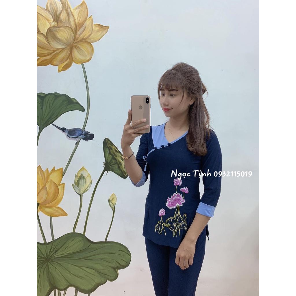 quần áo Phật tử cổ tàu cài chéo - đồ lam đi chùa Sen Hồng - set Phật tử nữ đẹp 0898553583
