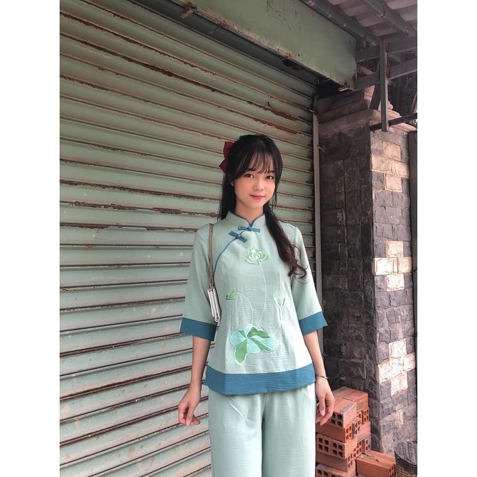Bộ đồ lam đi chùa nữ thêu sen chất liệu đũi thái, Pháp phục lễ chùa cổ tàu phối