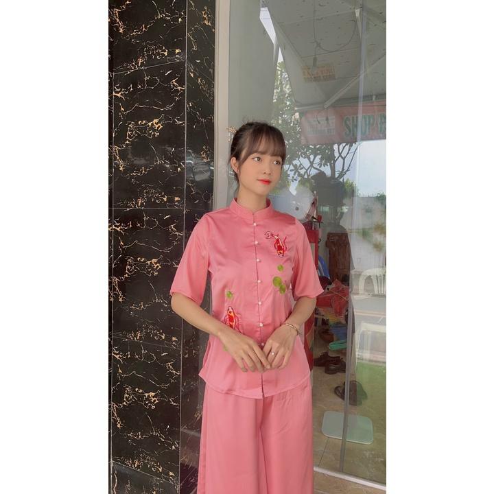 Mẫu pháp phục nữ - quần áo Phật tử đi chùa, đồ lam chất kate lụa mềm có co giãn Sen Hồng 0898553583